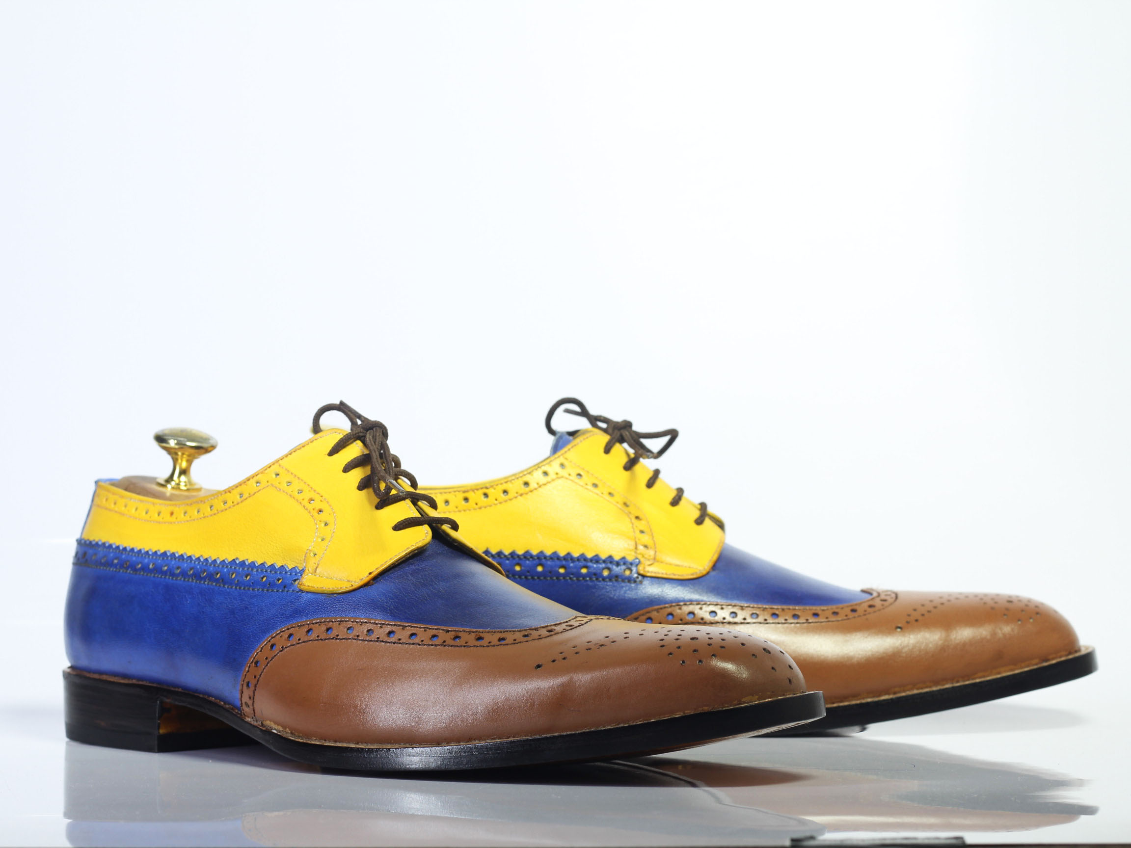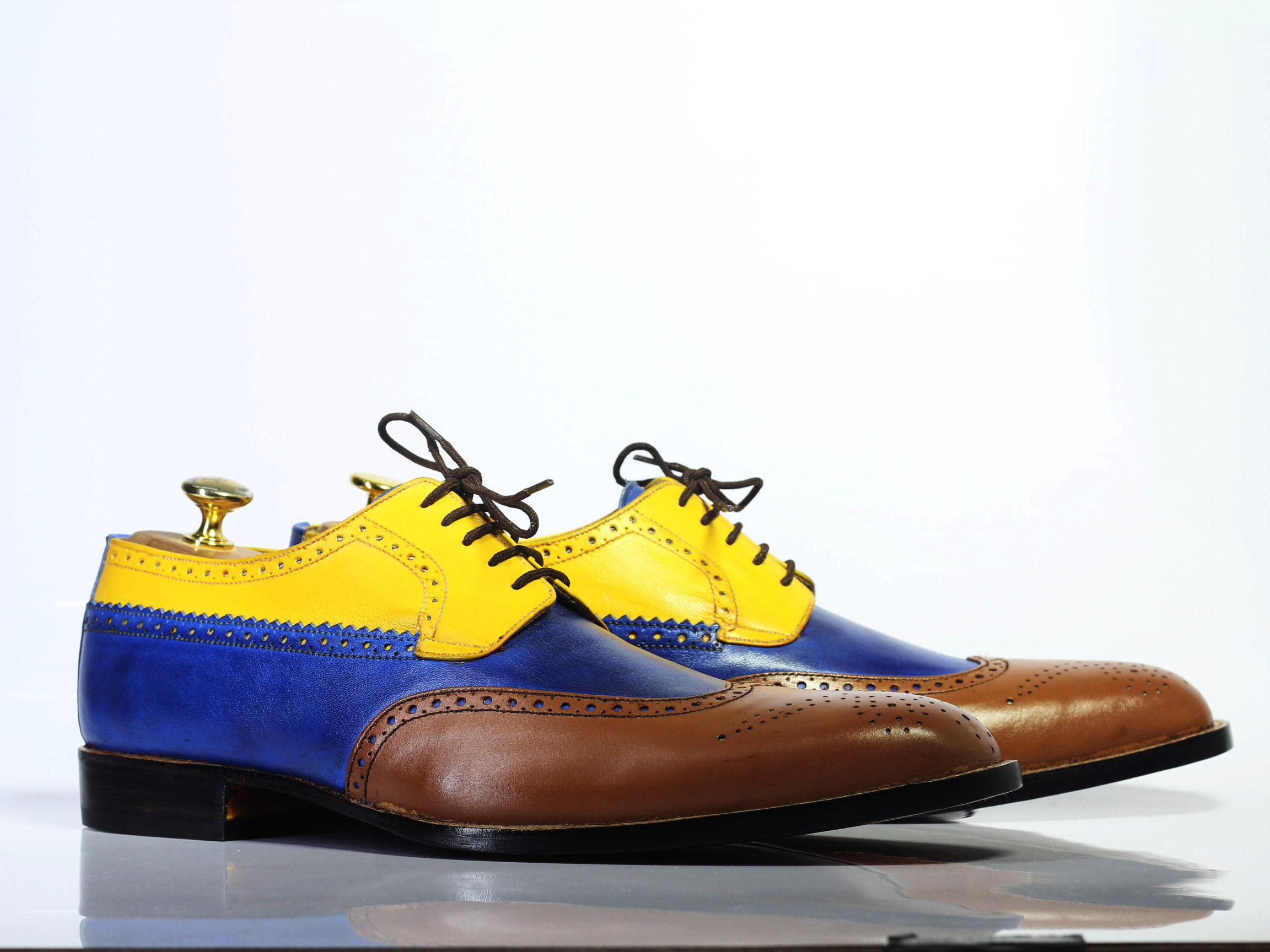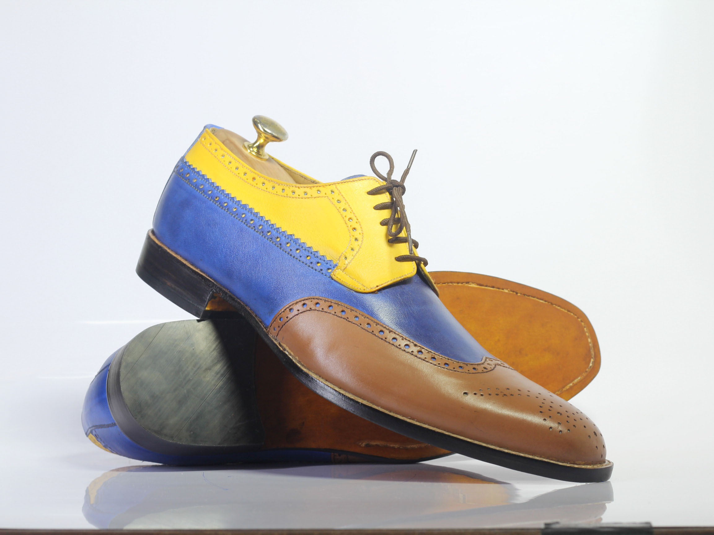 Handmade Multi Color Wing Tip Brogue Lace Up Leather Shoes For Men's