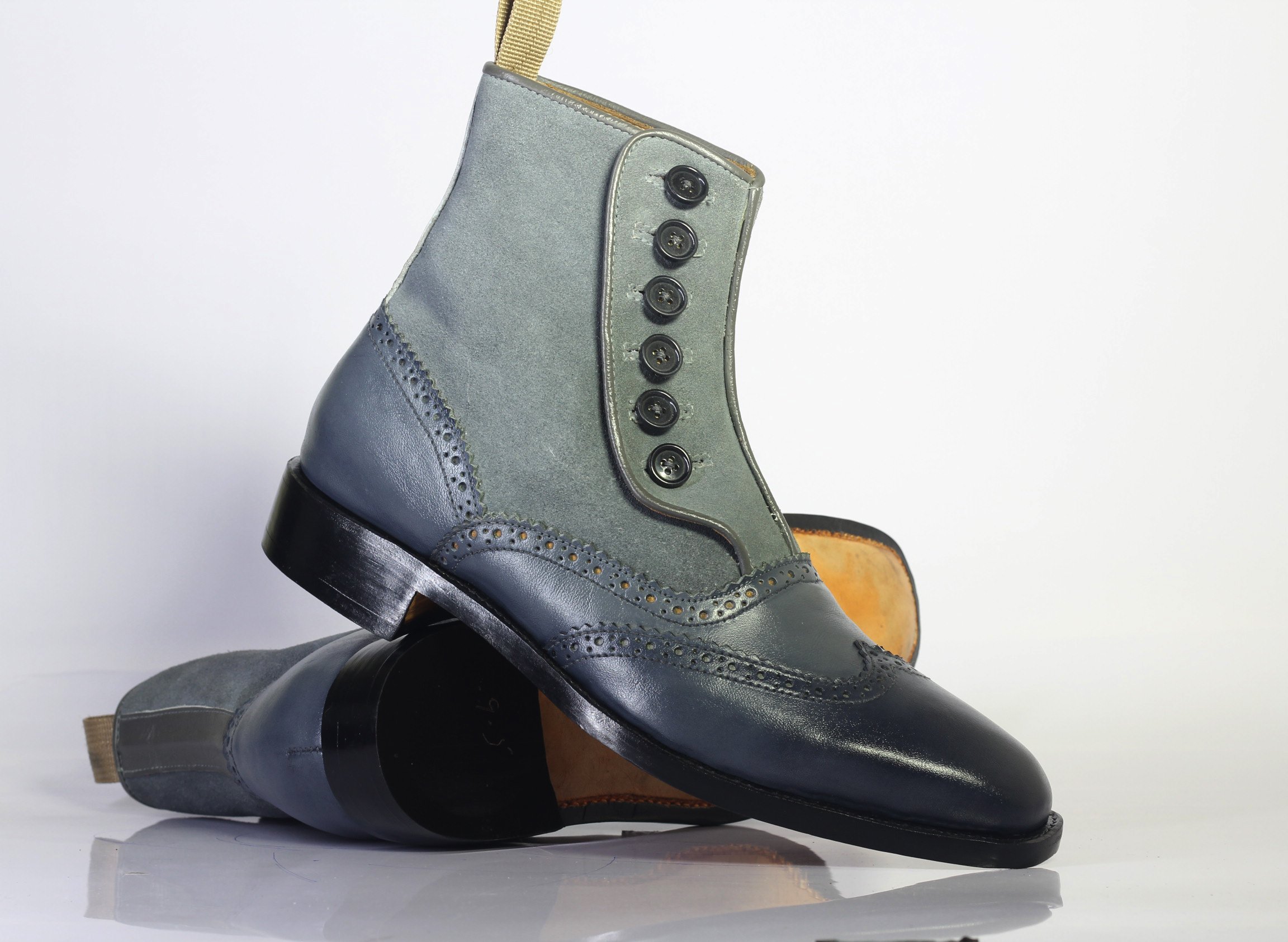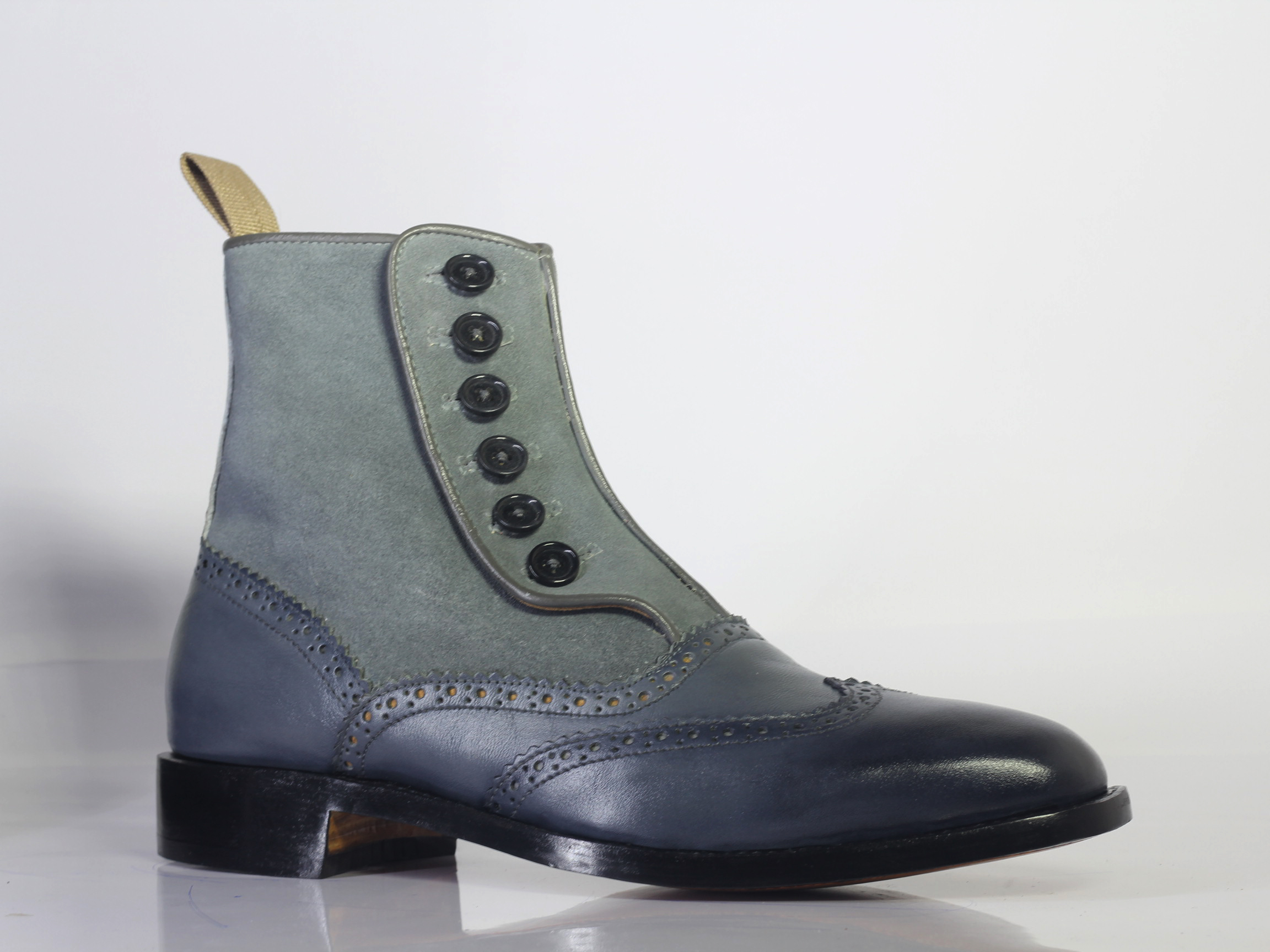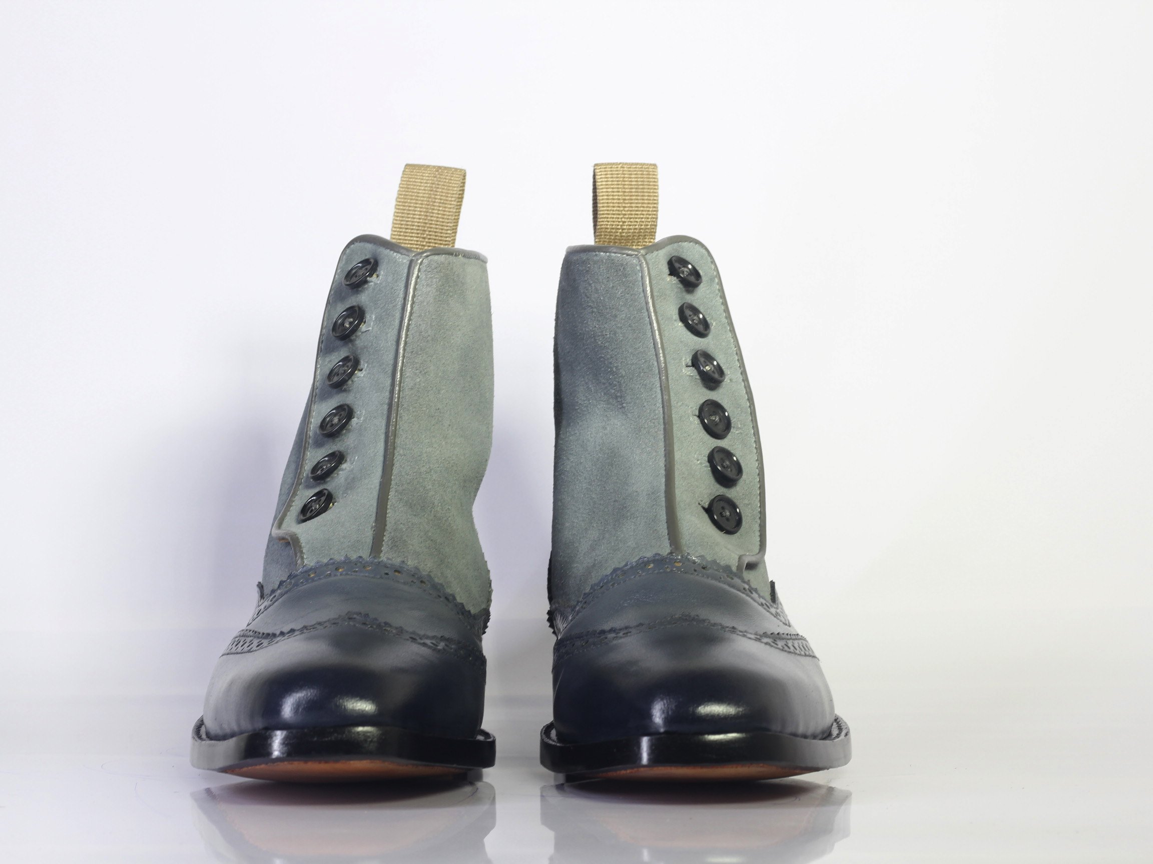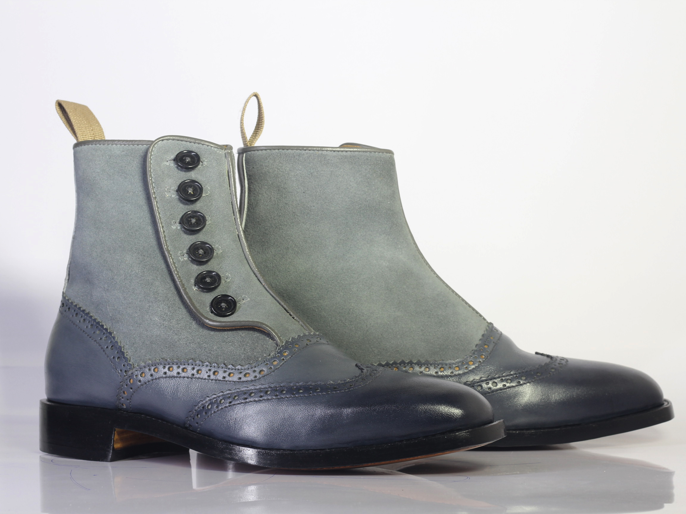 Handmade Men's Ankle High Gray Wing Tip Button Top Leather Suede Boots