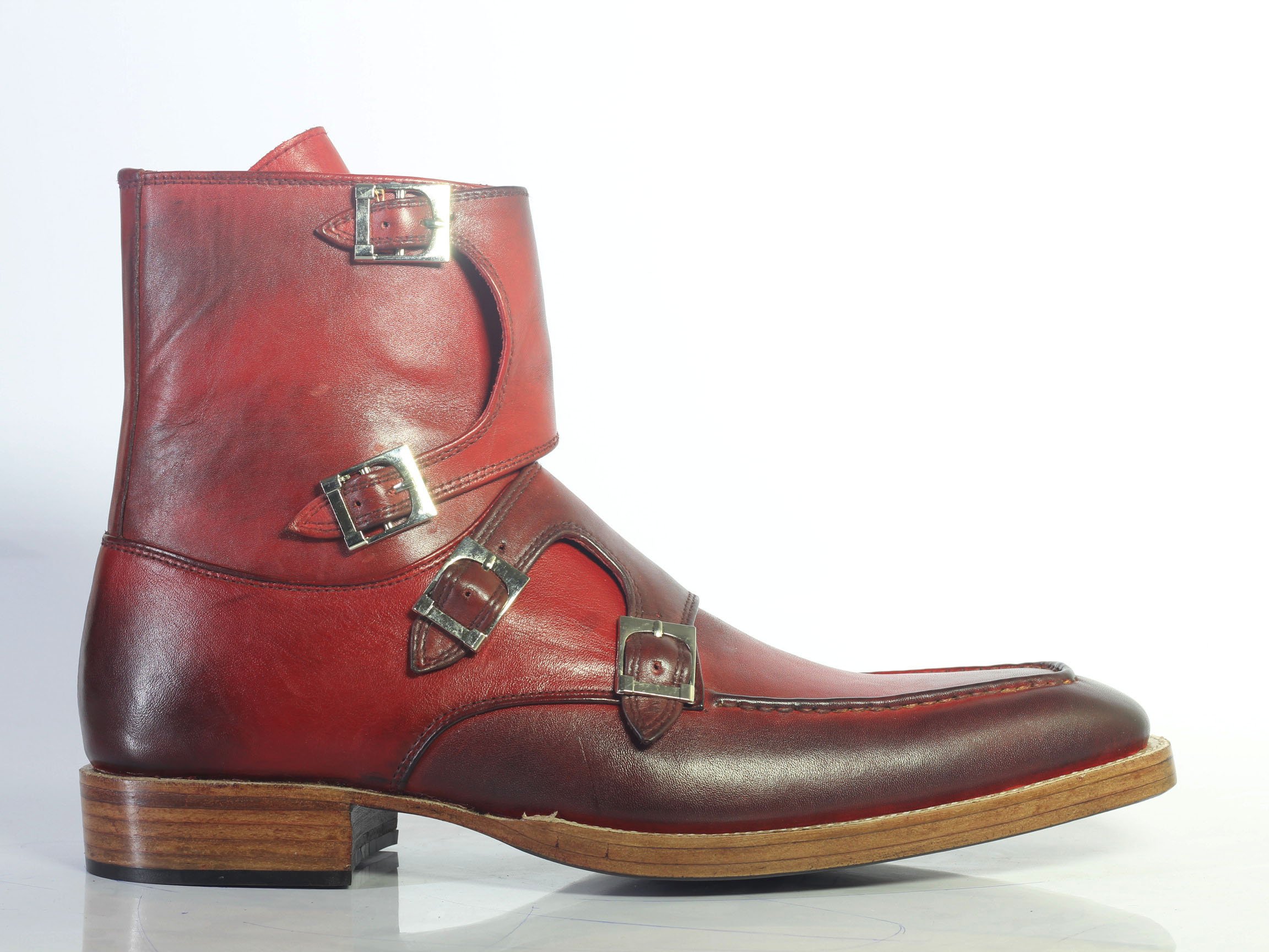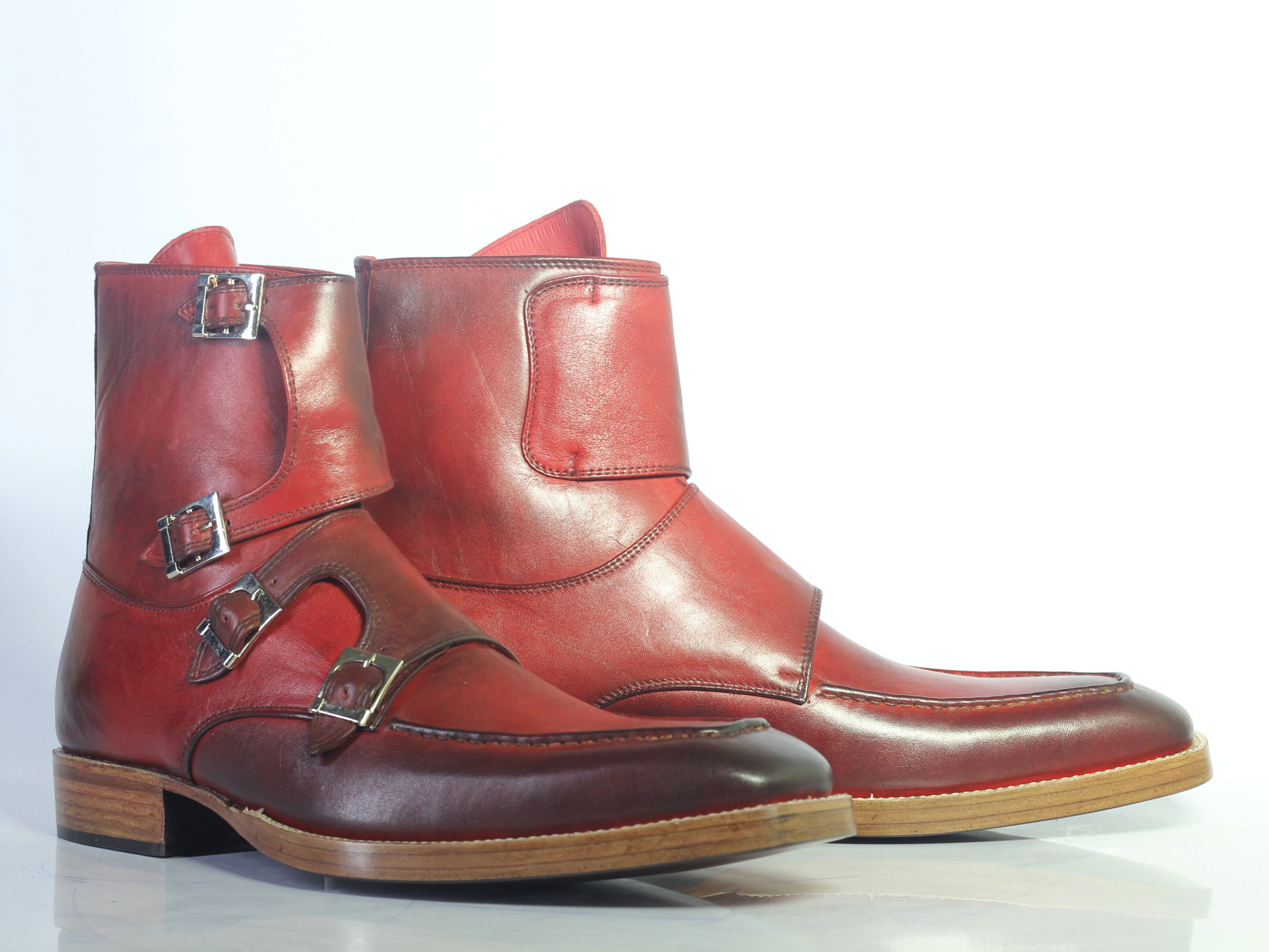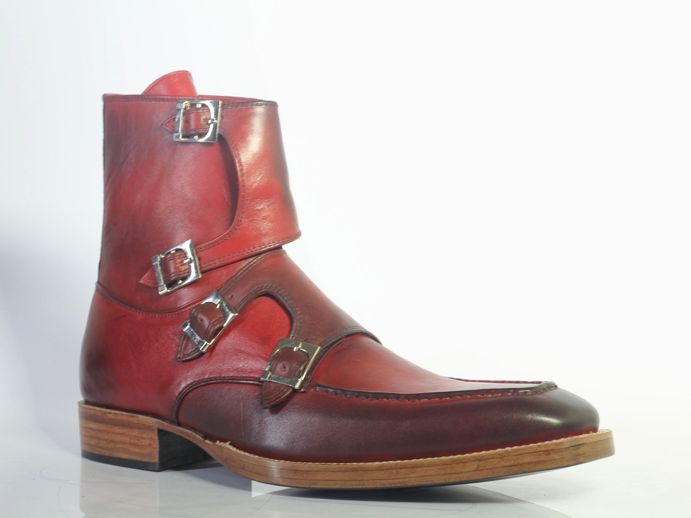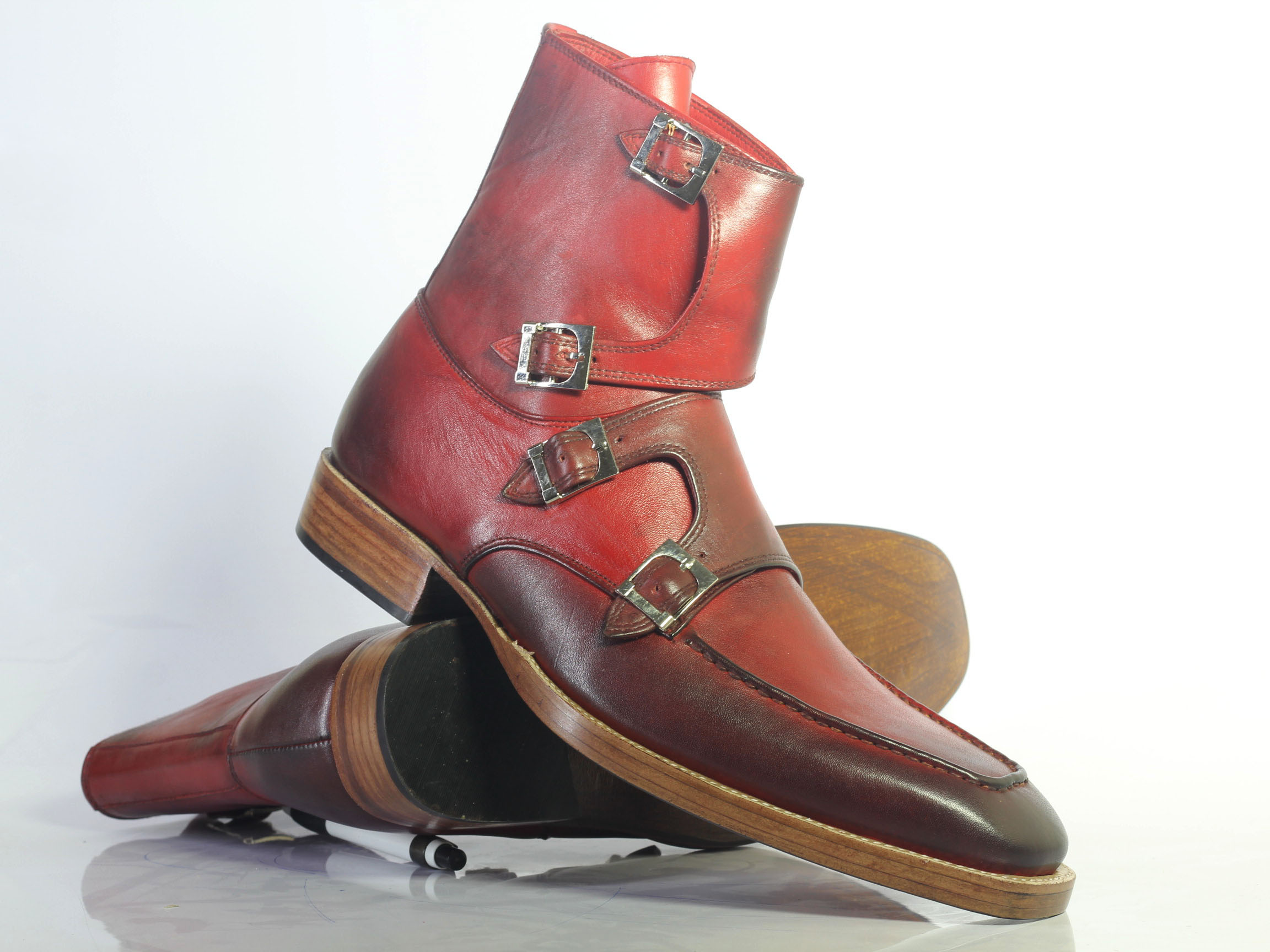 Handmade Men's Ankle High Burgundy Forth Monk Leather Boots