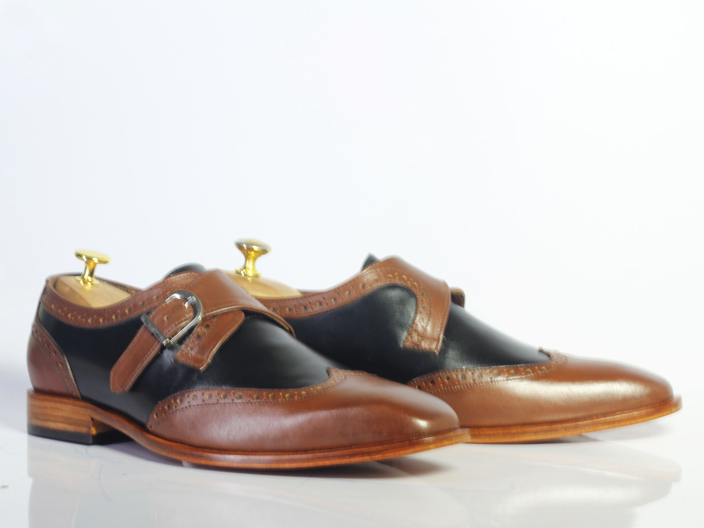 Handmade Brown & Black Wing Tip Monk Straps Leather Shoes For Men's