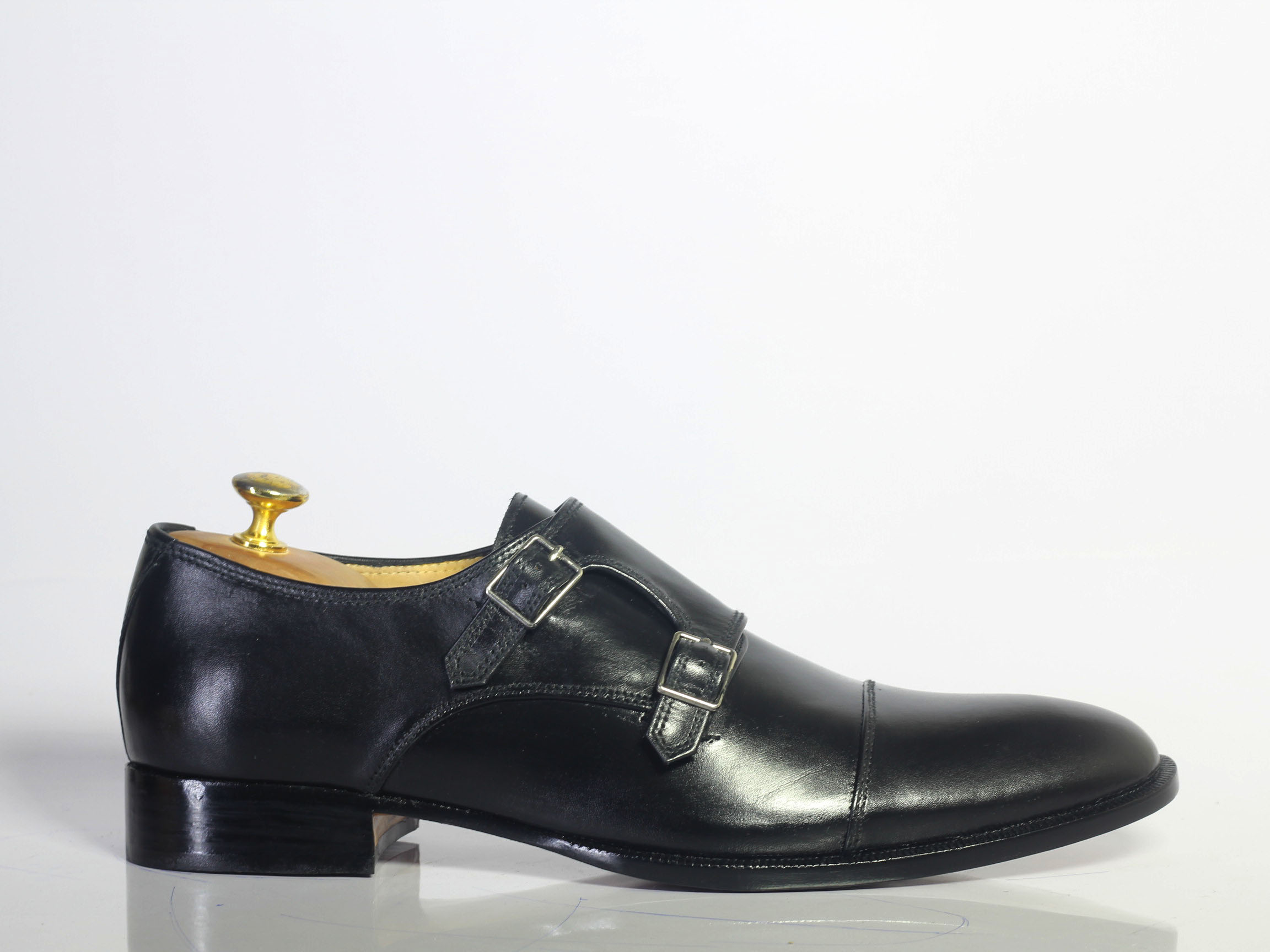 Handmade Black Cap Toe Double Monk Leather Shoes For Men's