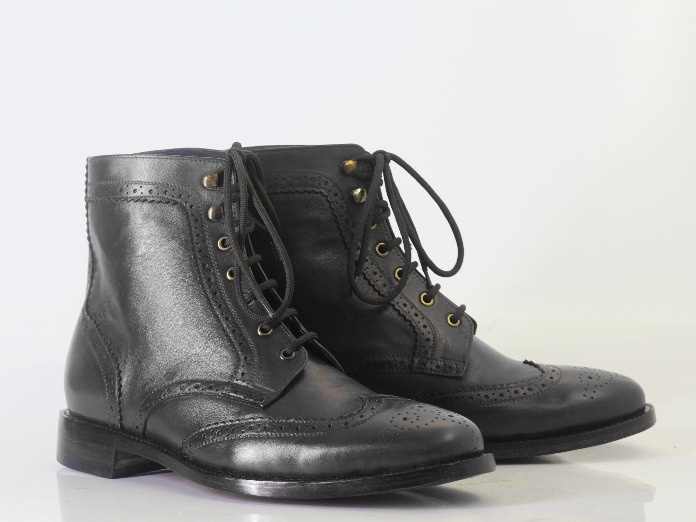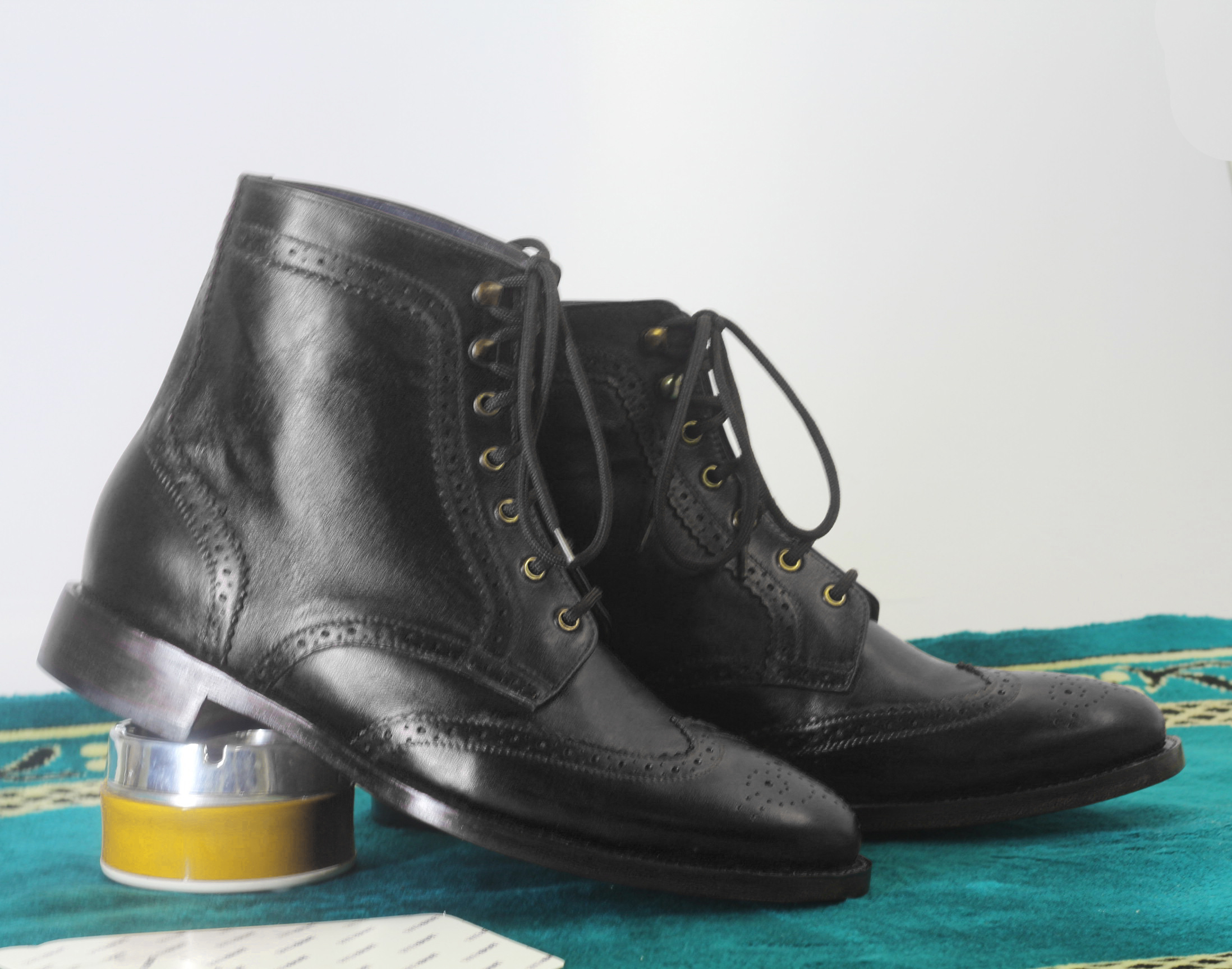 Handmade Men's Ankle High Black Wing Tip Leather Lace Up Boots