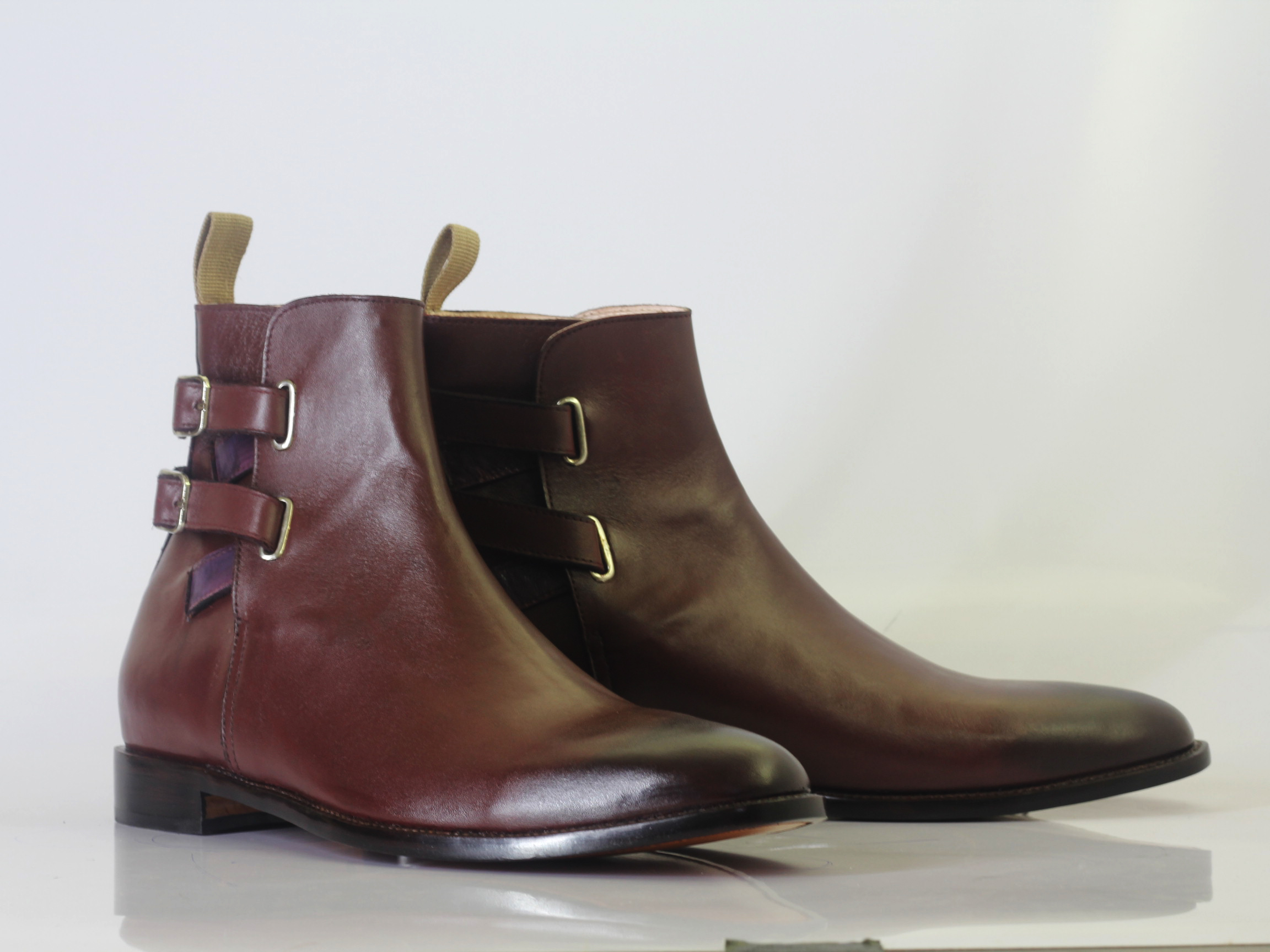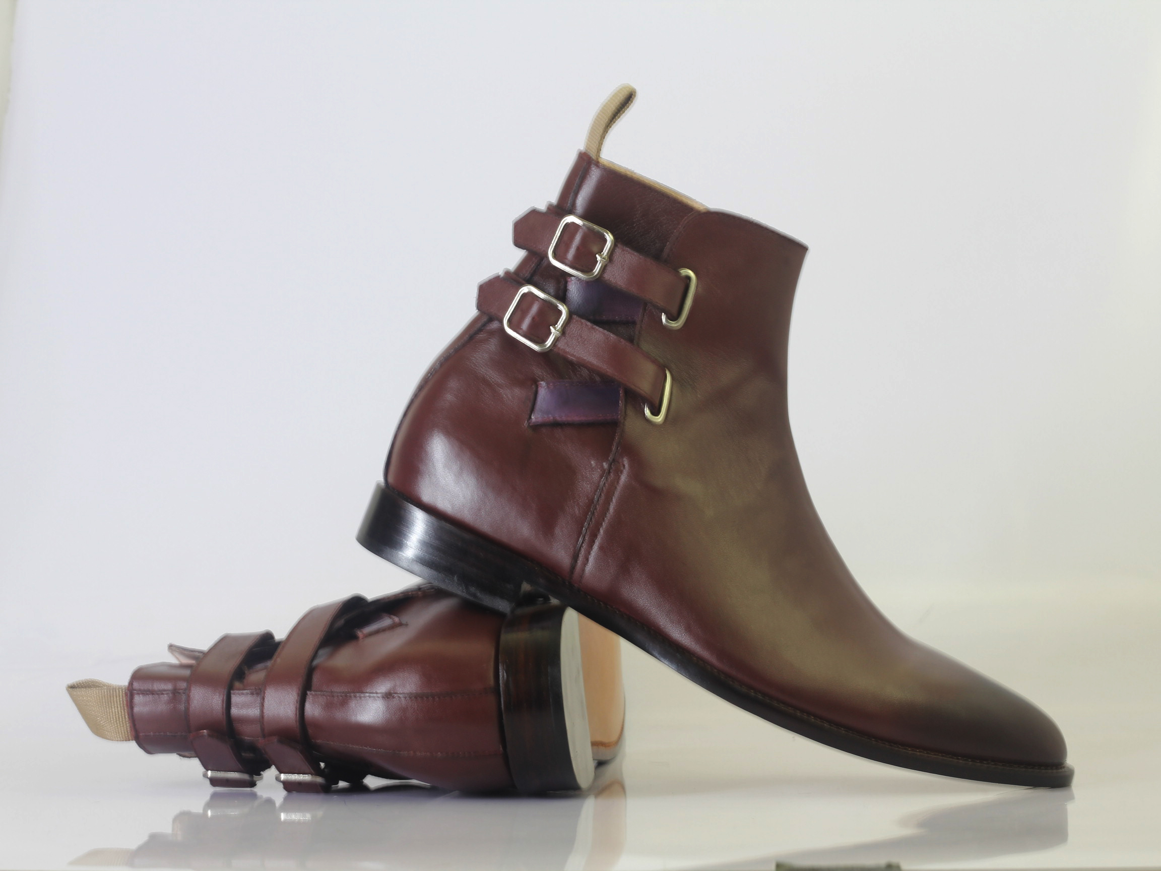 Handmade Men's Ankle High Burgundy Double Buckle Leather Boots