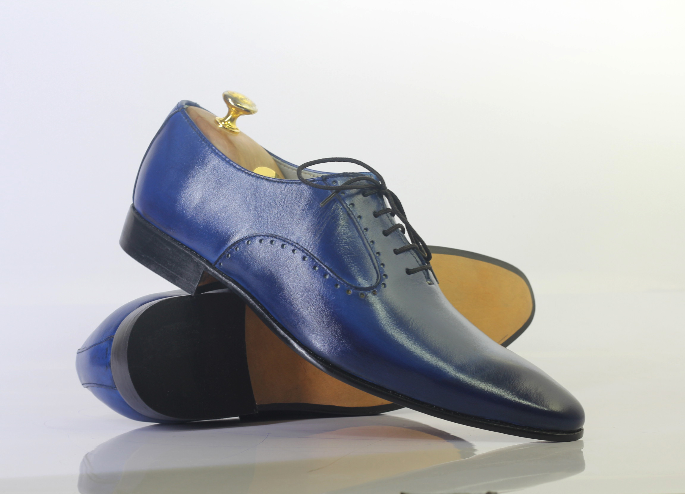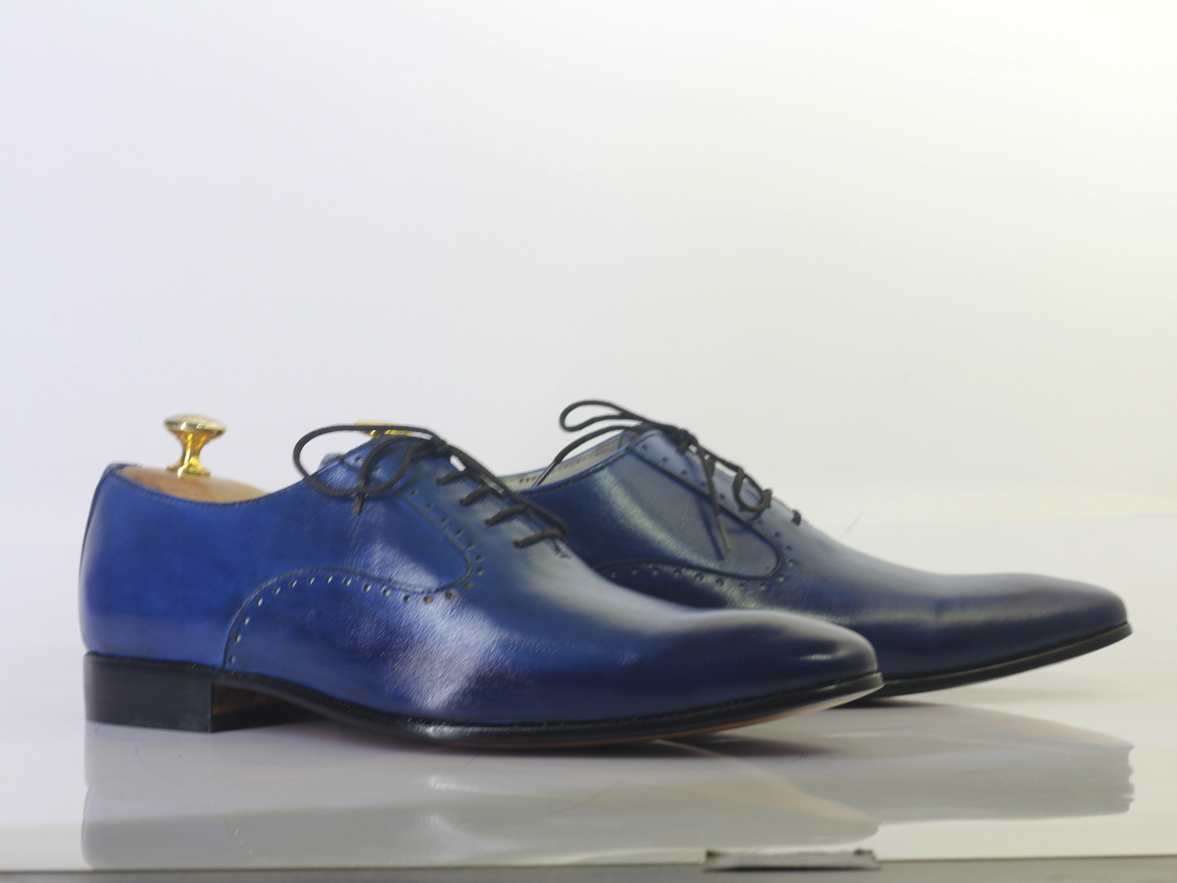 Handmade Blue Pointed Toe Lace Up Leather Shoes For Men's