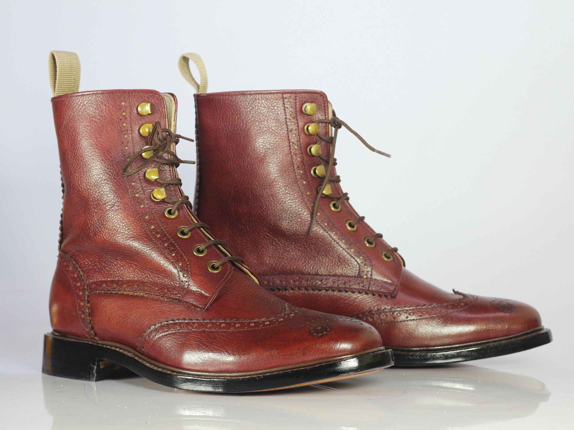 Handmade Men's Fashion Burgundy Wing tip Pebbled Leather Ankle Lace Up Boots