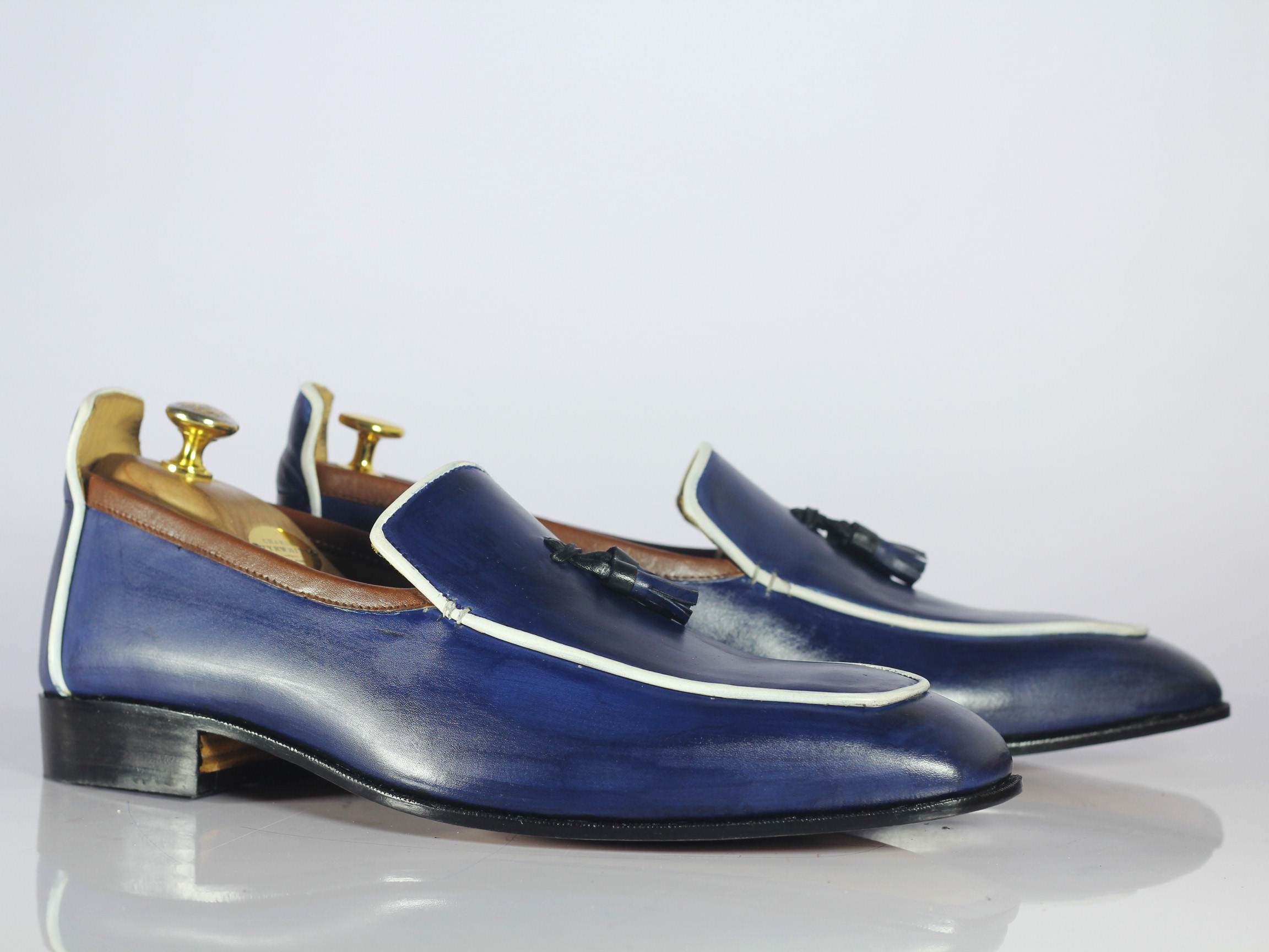 Handmade Blue Tussles Leather Loafers Shoes Stylish Shoes For Men's