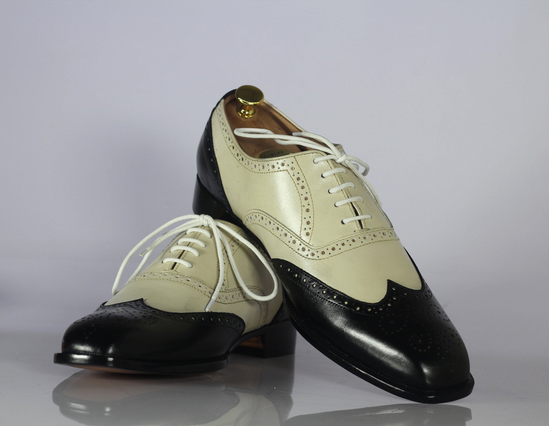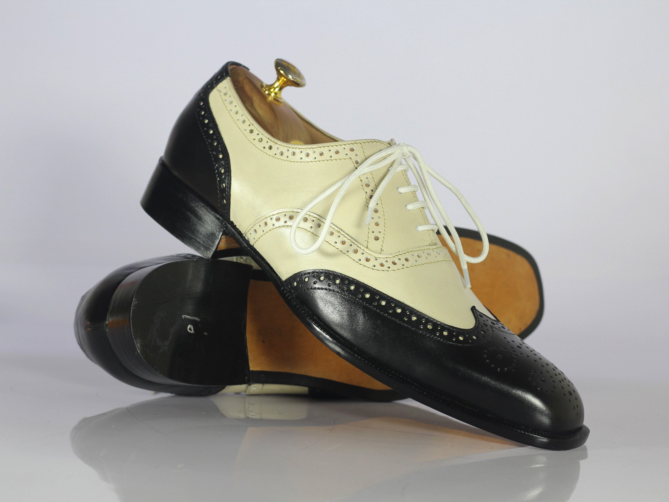 Men's Wing Tip Shoes, Men's Off White Black Leather Lace Up Shoes.