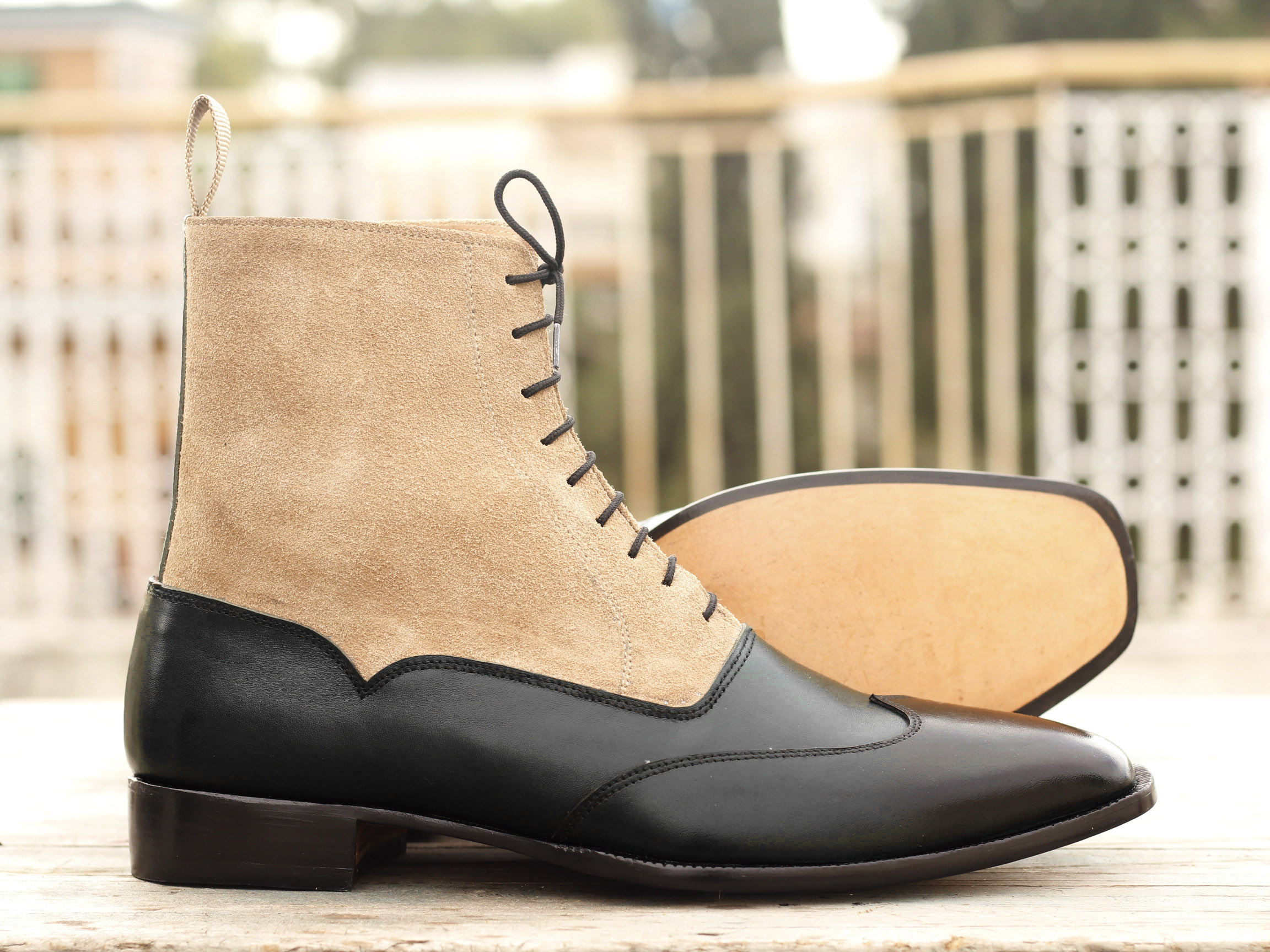 Men's Black & Beige Leather Boots, Chelsea Ankle Boot