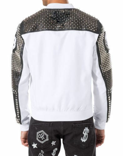 Men White Black Silver Studded Embroidery Patches Cowhide Biker Leather Jackets