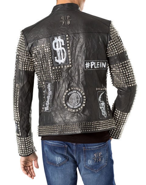 New Phillip Plain Black Full Studded Embroidery Patches Leather jacket Biker Men