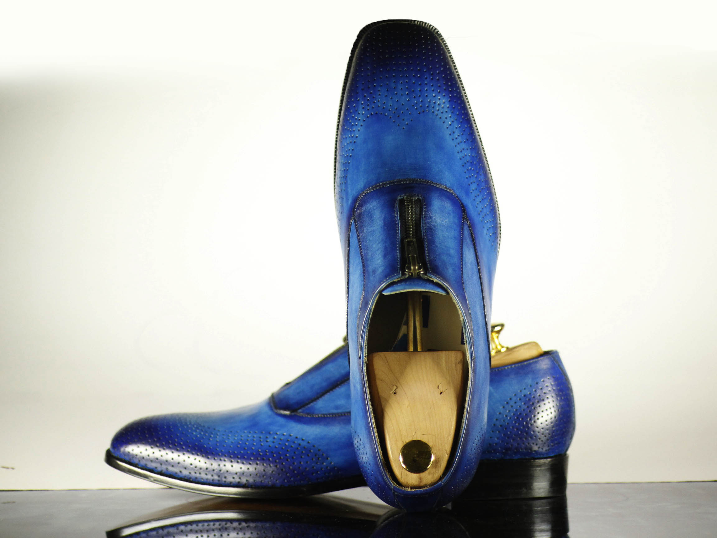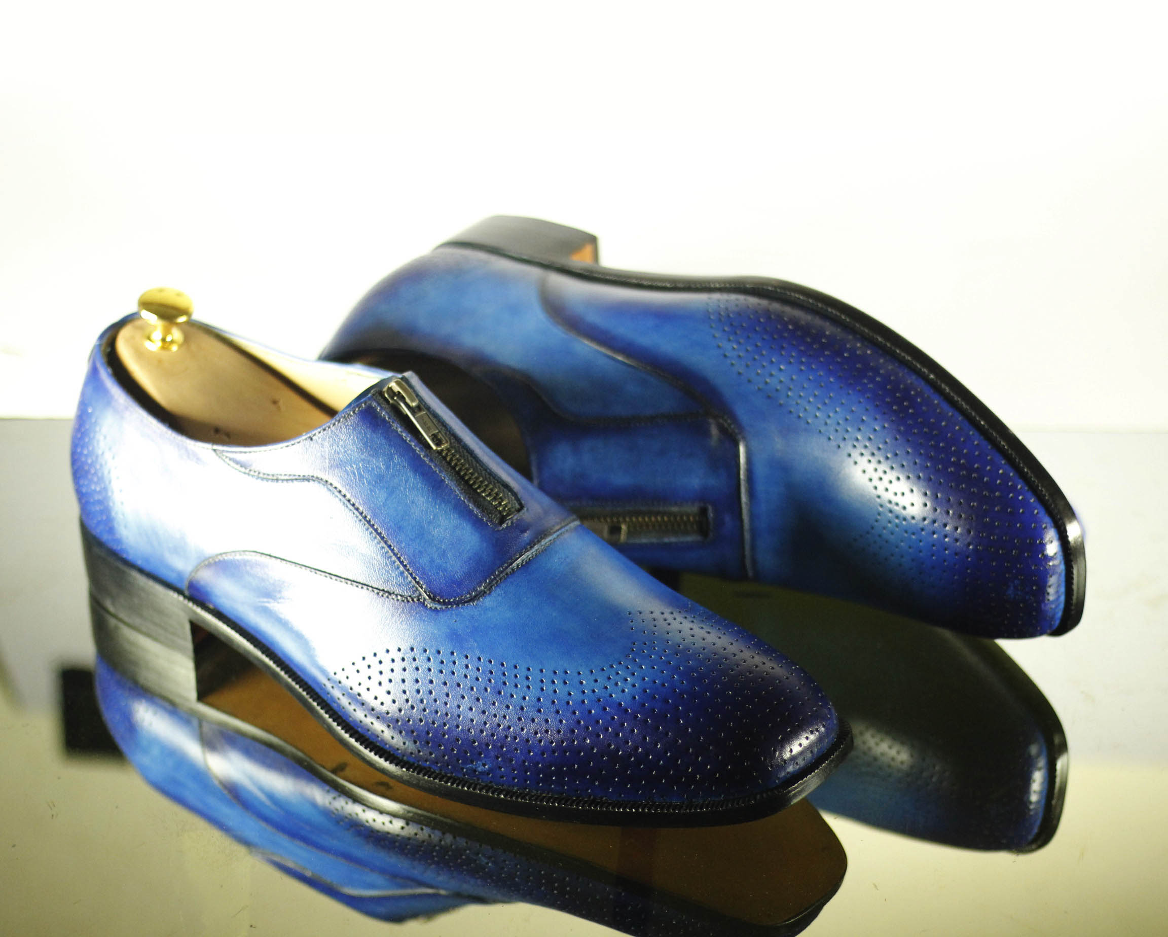 Handmade Men's Casual Shoes, Men's Blue Wing Tip Leather Zip Style Formal Shoes