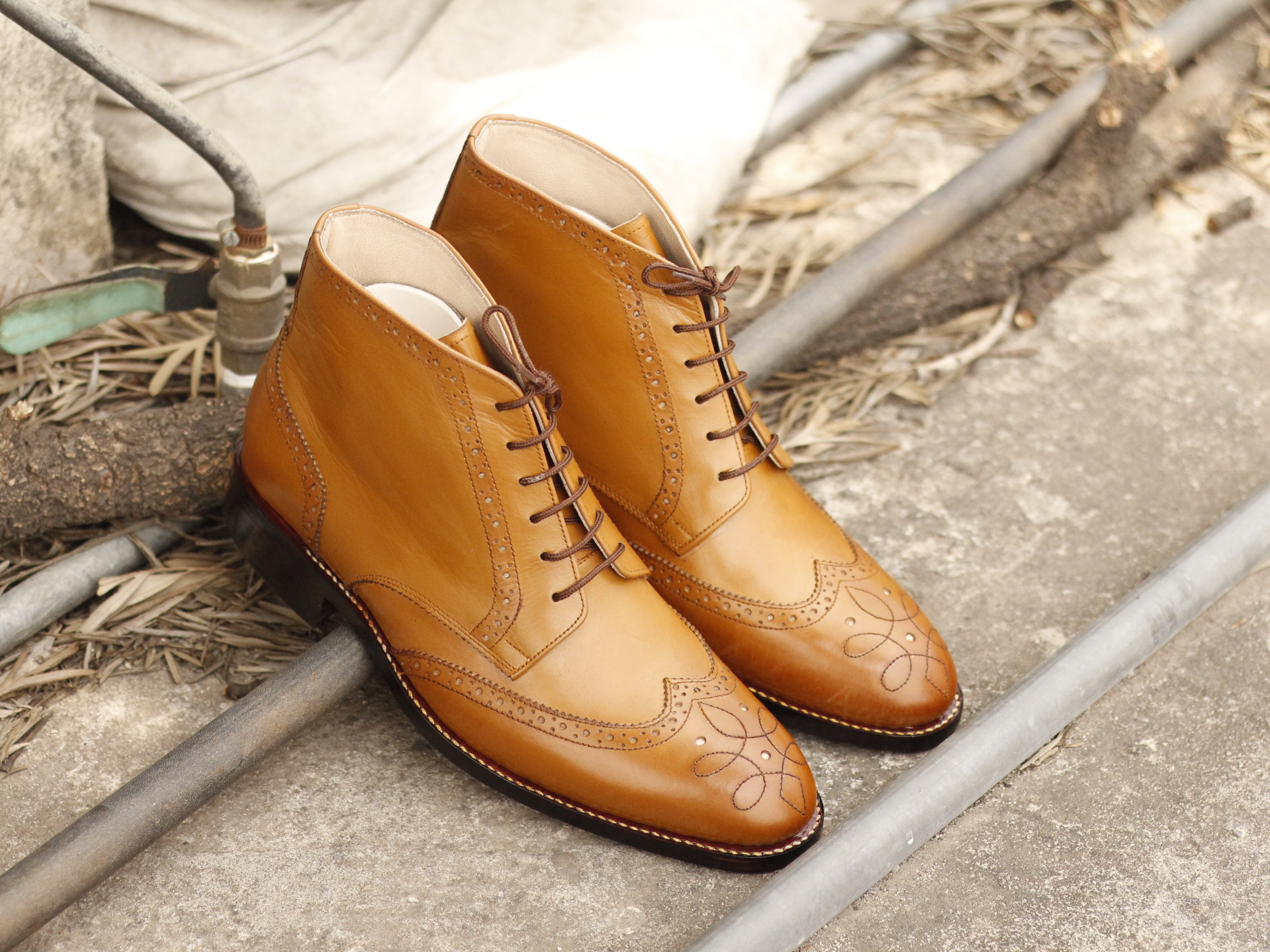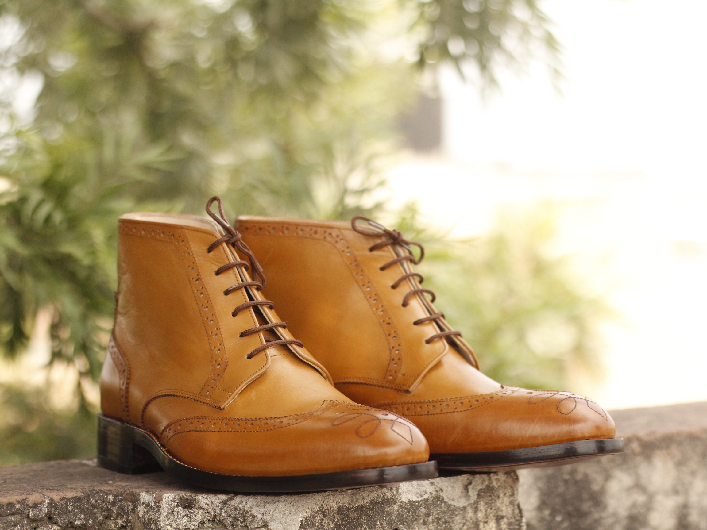 Hand Crafted Men's Tan Wing Tip Ankle boots, leather boots, Lace Up formal boot for Men