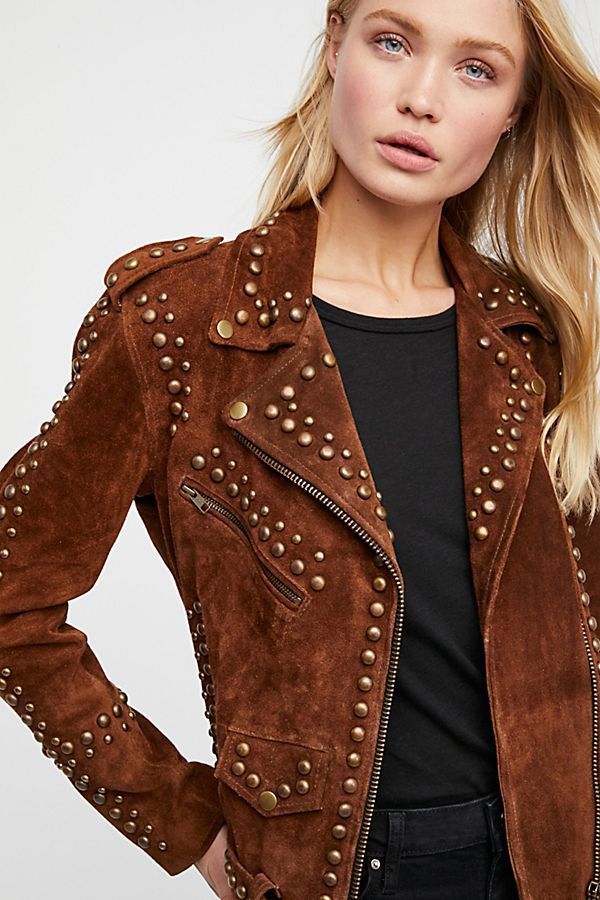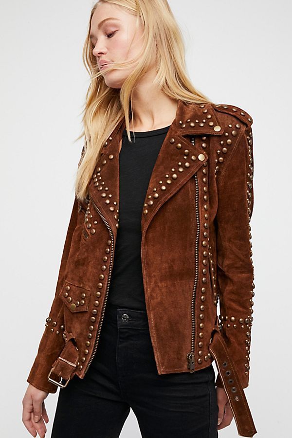 Woman Handmade Brown American Western Were Golden Studded Suede Leather Jacket