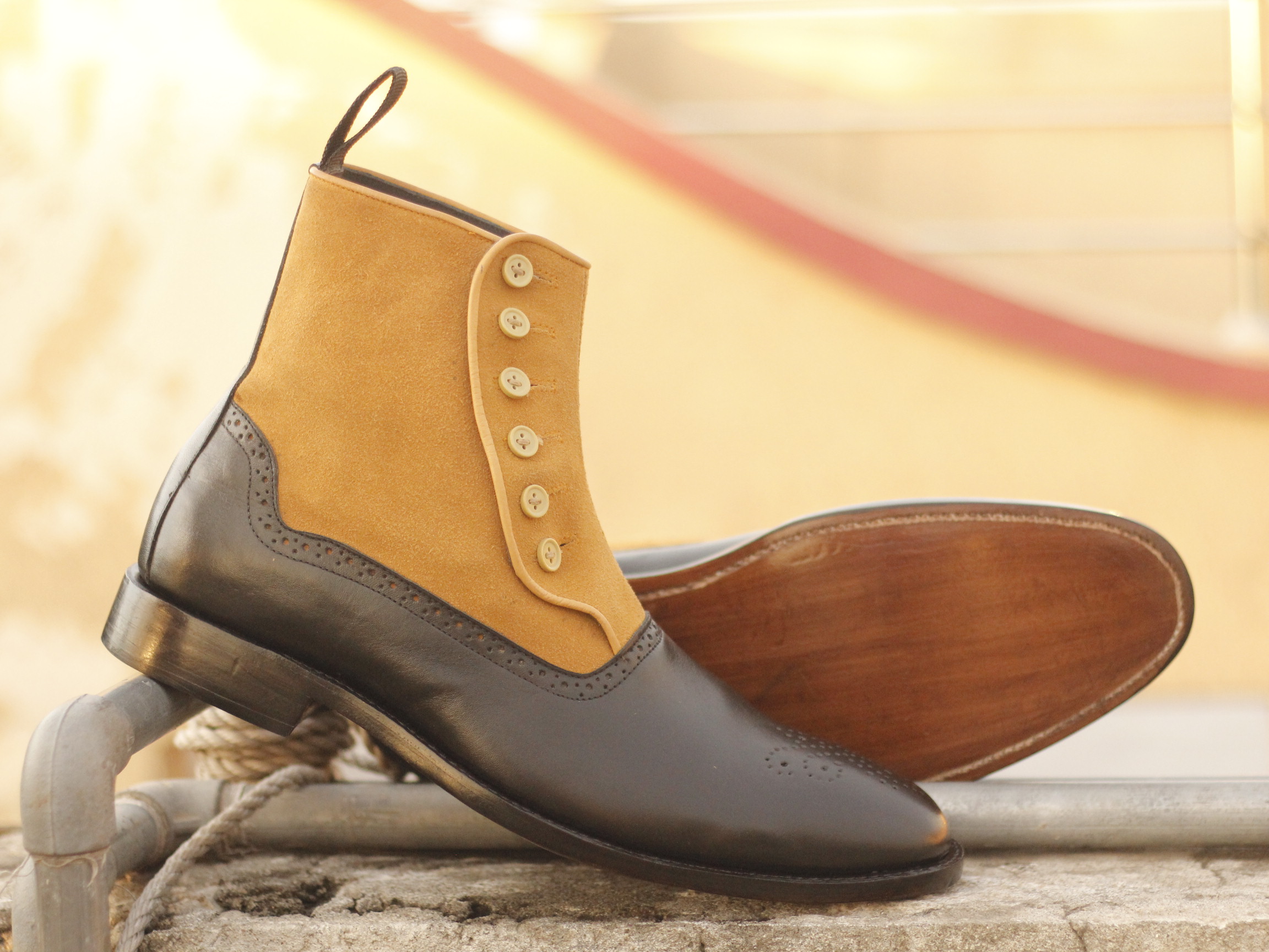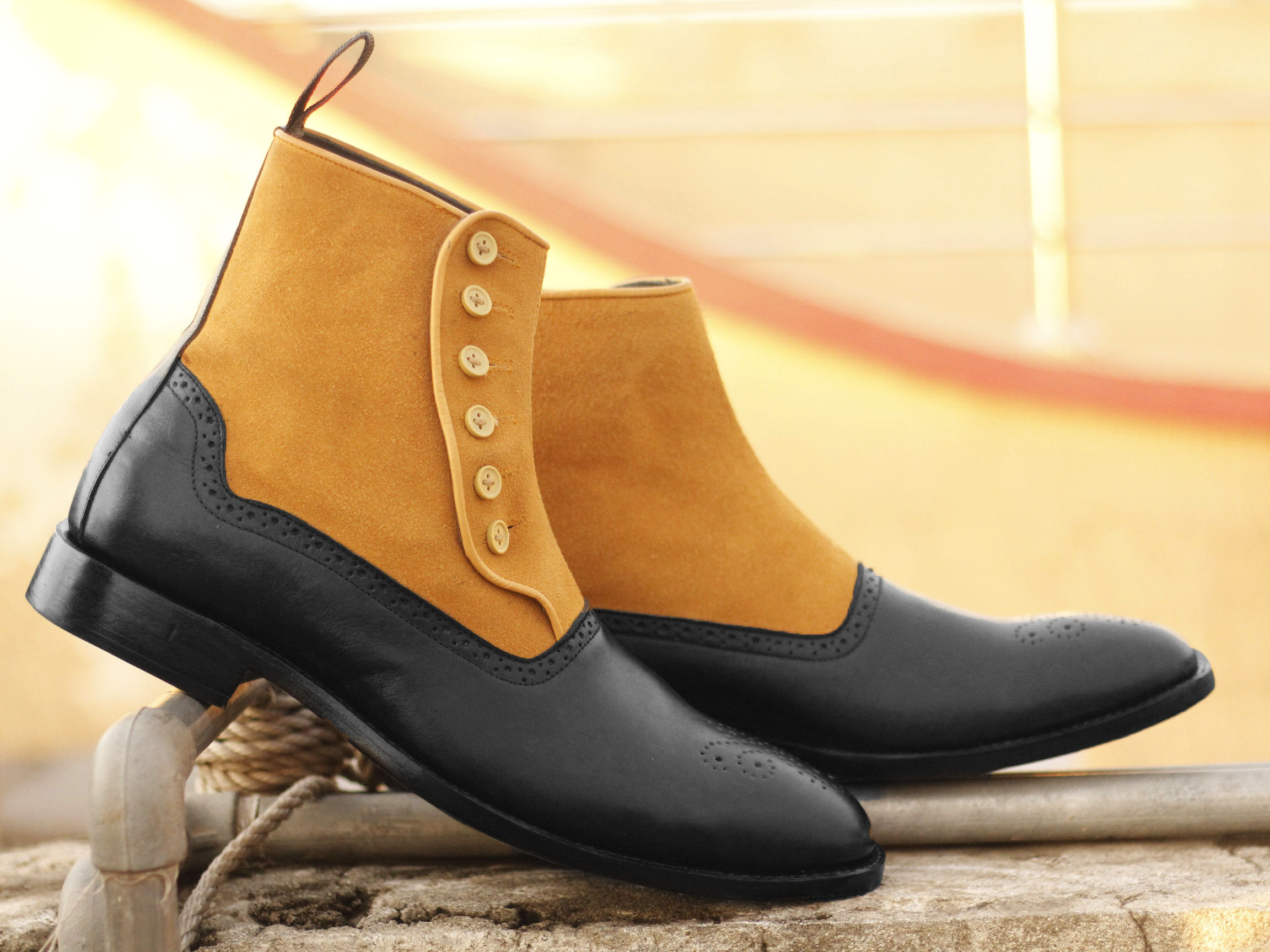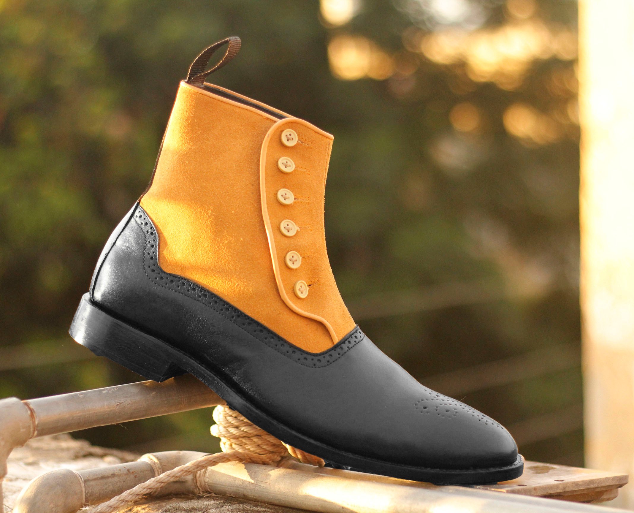Handmade Ankle High Tan Black Boot, Men's Handmade Leather Suede Button Top Brogue Boots For men's