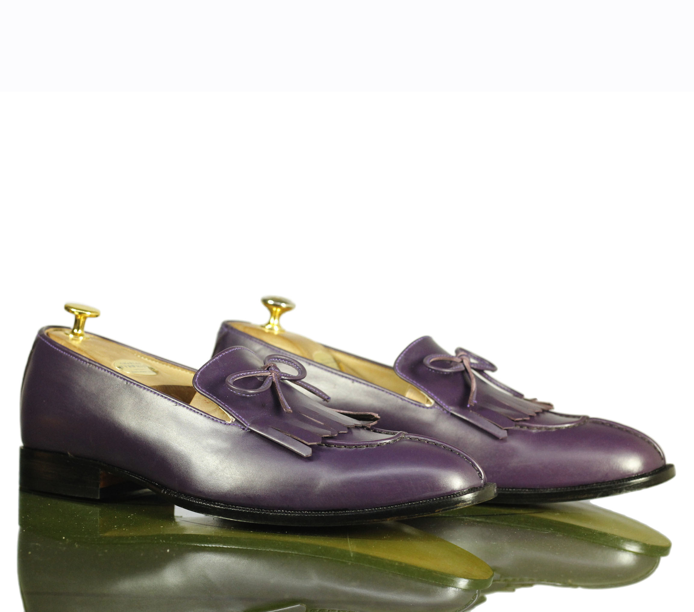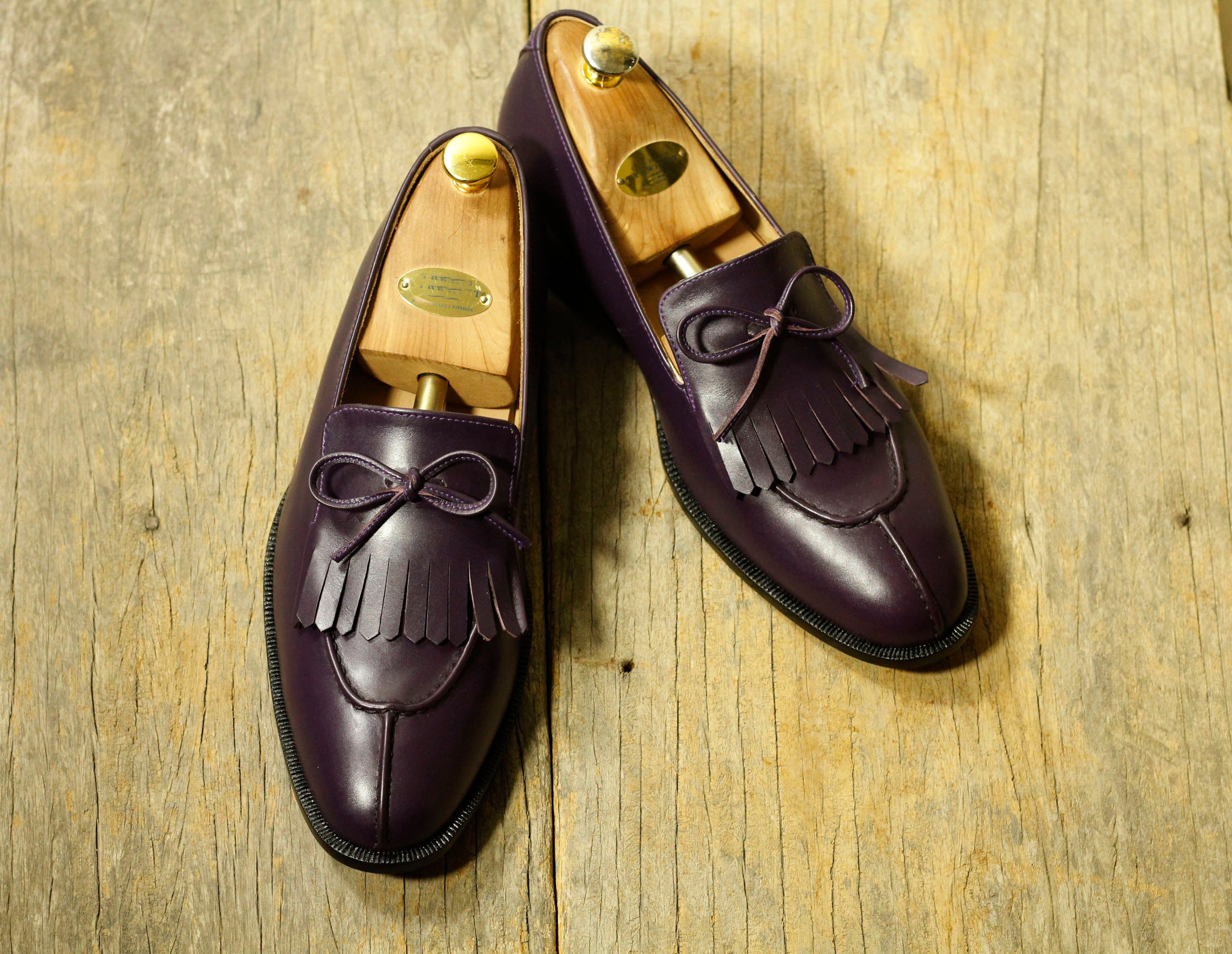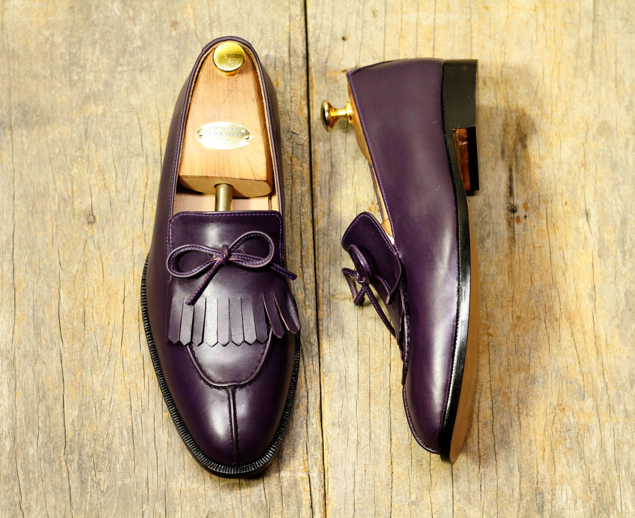 Handmade Men's Fringe Split Toe Shoes, Men's Purple Leather Tussles Shoes