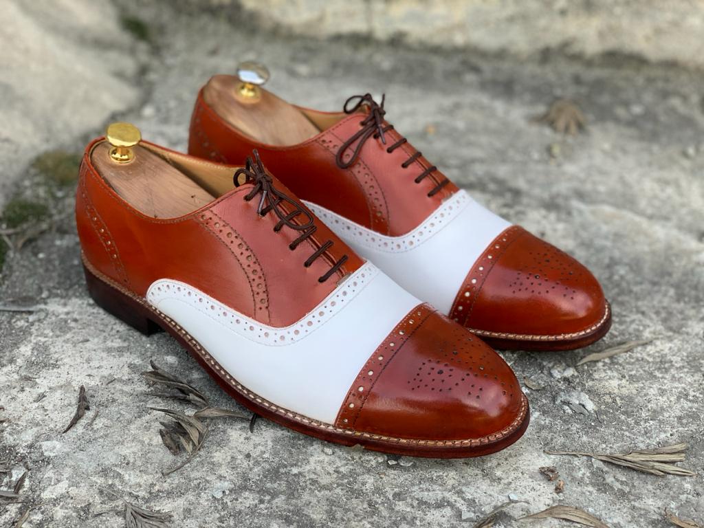 Bespoke White & Brown Square Toe Leather Shoes,Men Handmade Dress Oxford Shoes