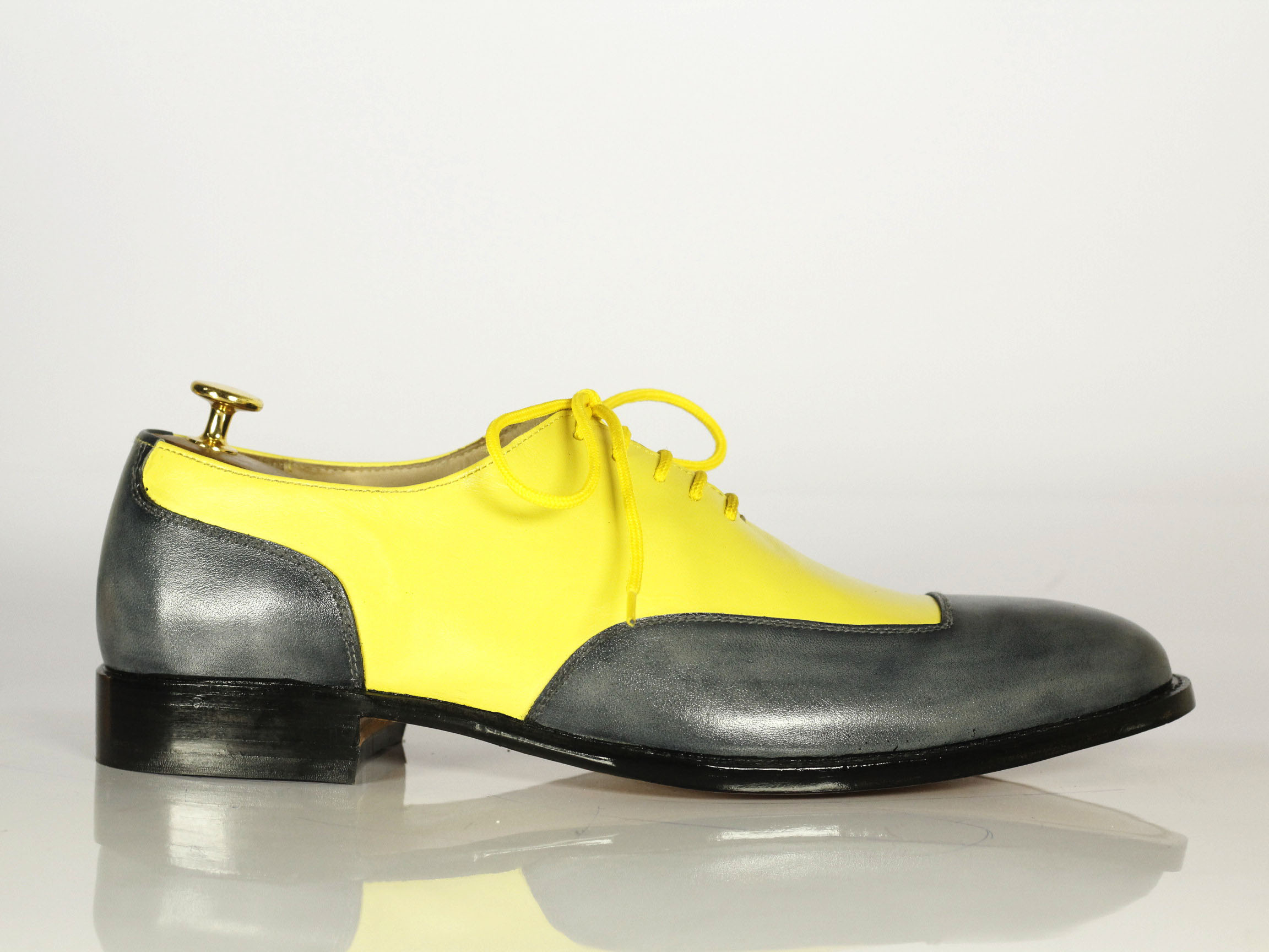 Handmade Men's Fashion Shoes, Men's Yellow and Gray Color Leather lace Up Fashion Shoes.