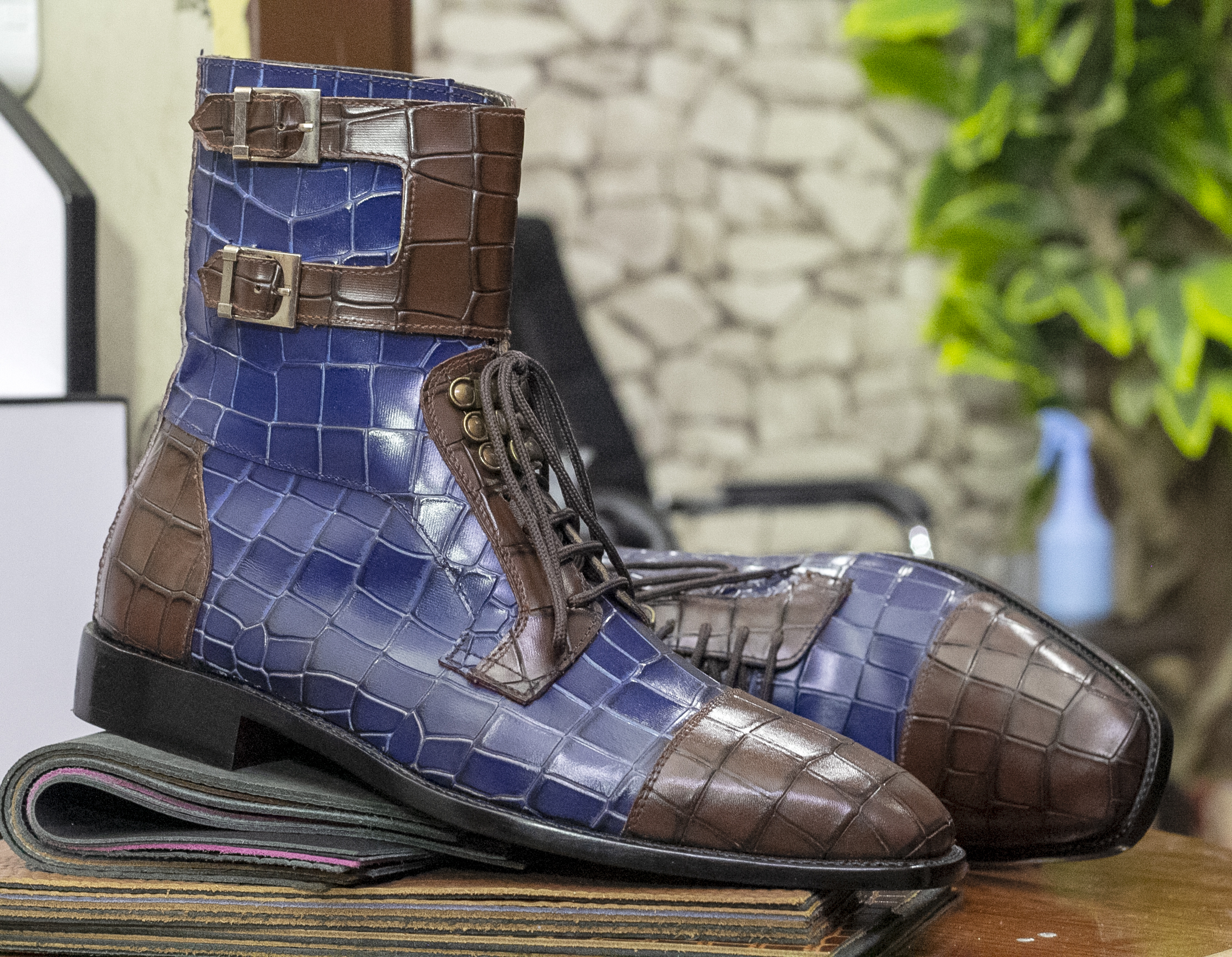 Men's Brown Blue Leather Ankle Boots, Men Alligator Leather Boots