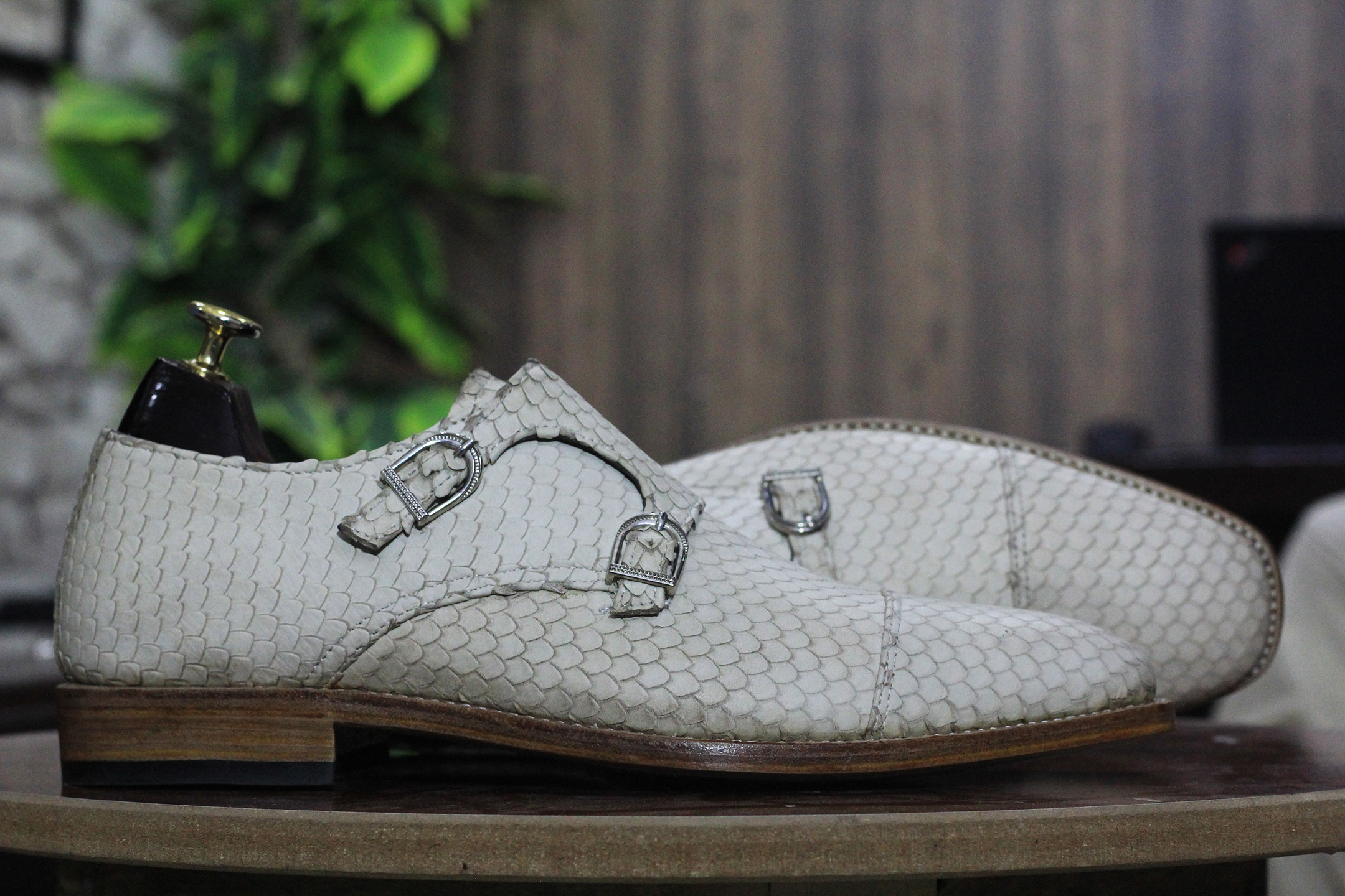 Handmade Python Texture Leather Monk Shoes , Dress Formal Shoes, Green Two Tone Shoes