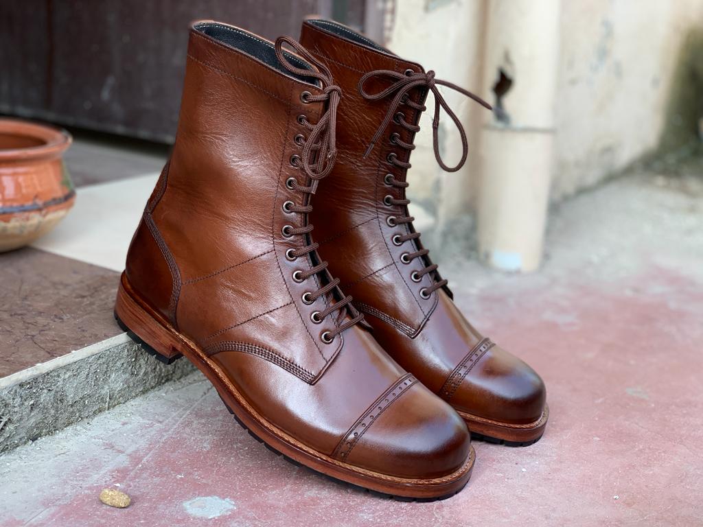 Men's Ankle High Pure Brown Leather Lace Up Boot, Handmade Cap Toe Leather Boot