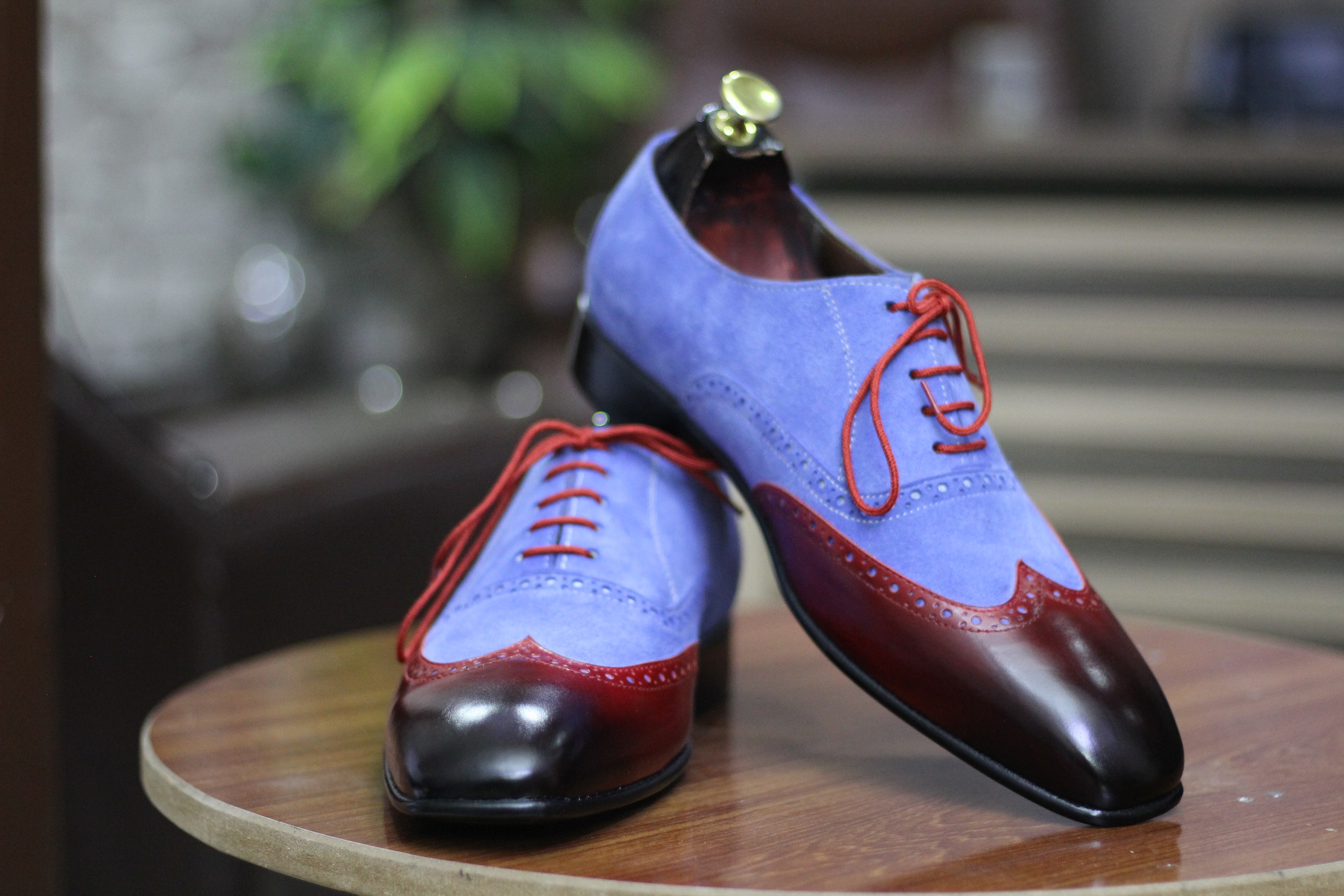 Men's Bespoke Handmade Camel and Brugundy Color Lace Up Wing Tip Style Leather Suede Classic Shoes