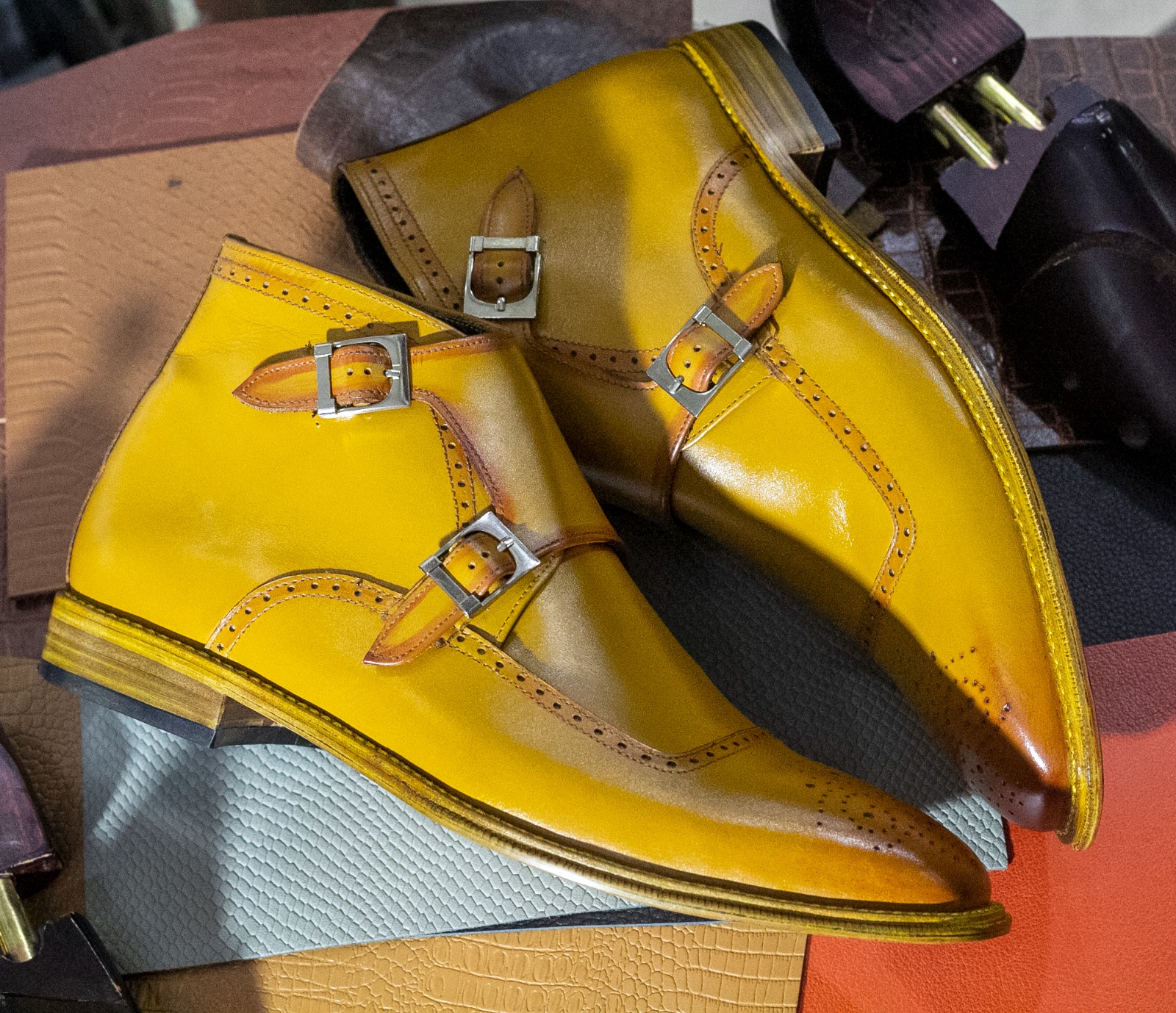 Men's Half Ankle Two Shaded Color Double Buckle Style Pure Handmade Leather Brogue Toe Boots