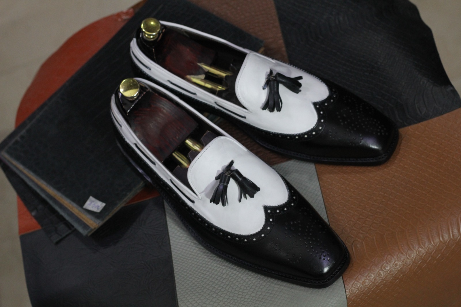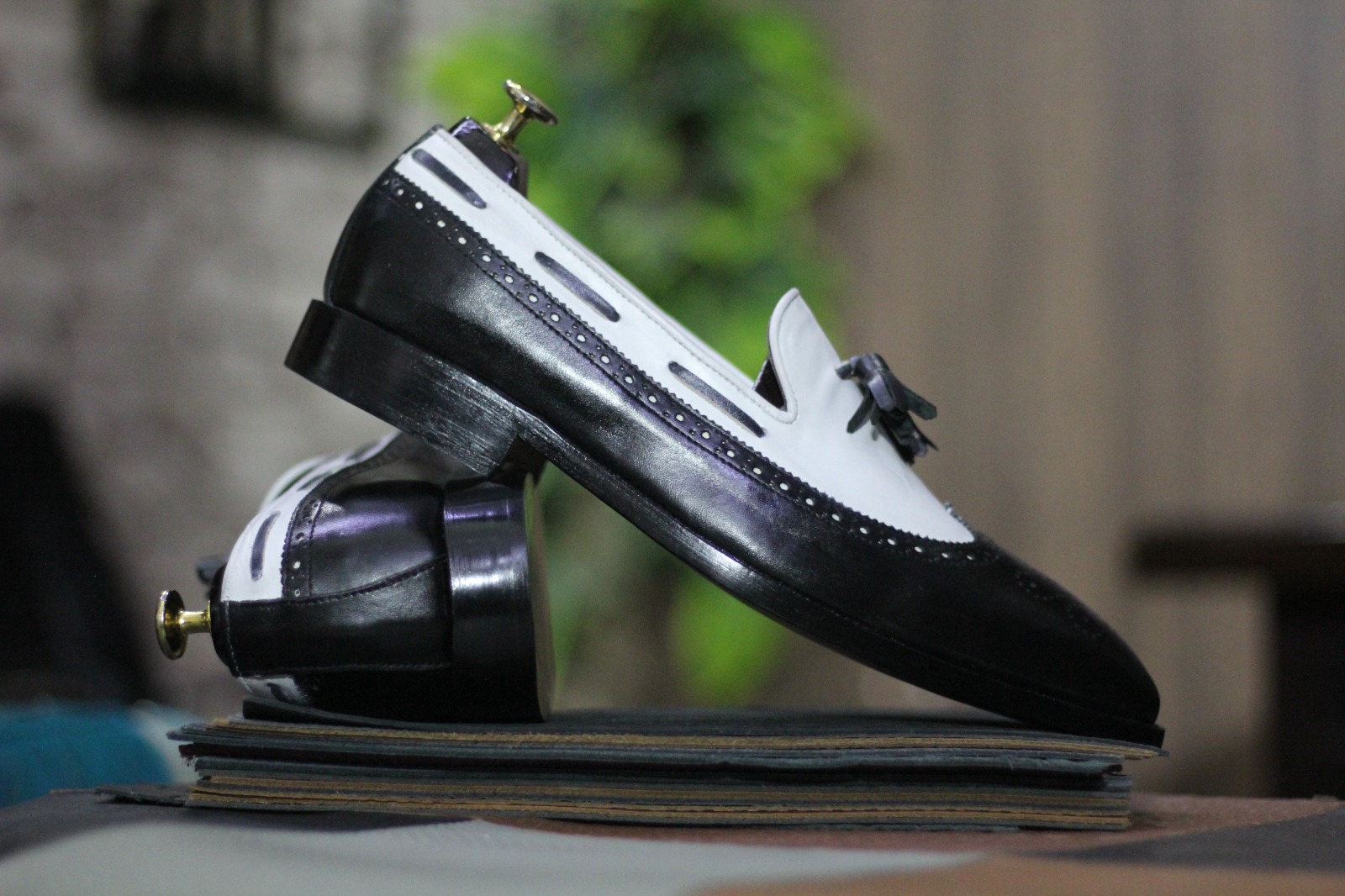 Bespoke Handmade Black and White Color Tussle Loafer Wing Tip Brogue Toe Party Wear Men's Designer Leather Shoes