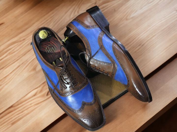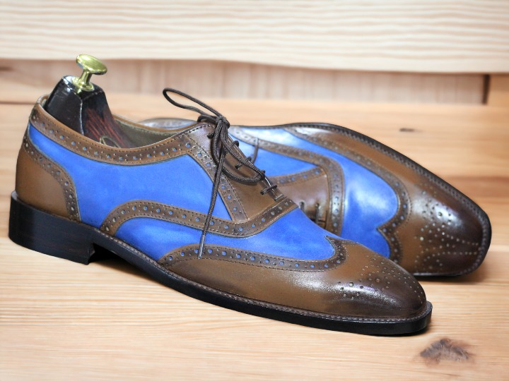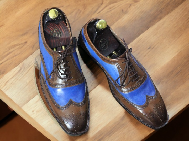 New Stylish Wing Tip Brogue Toe Lace Up Brown Blue Colour Genuine Leather Shoes for Men's