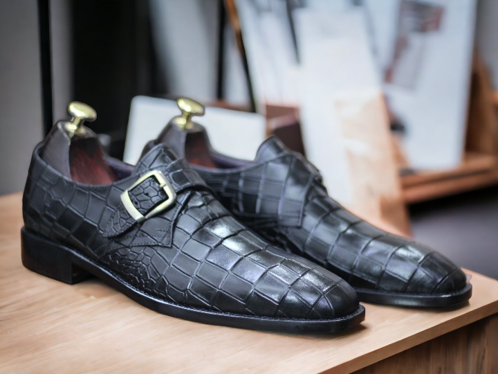 Men's Bespoke Handmade Alligator Texture Leather Black Color Single Buckle Shoes