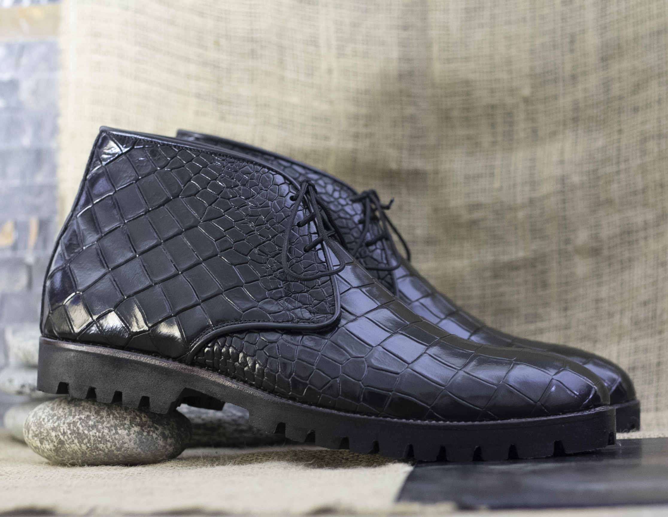 Handmade Alligator Texture Pure Leather Men's Black Color Derby Lace Up Style Ankle Boots