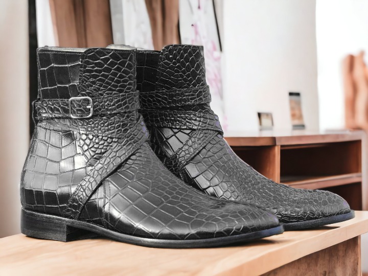 New Stylish Handmade Men's Black Aligator Textured Leather Jodhpurs Boot, Ankle Boot, Fashion Boot