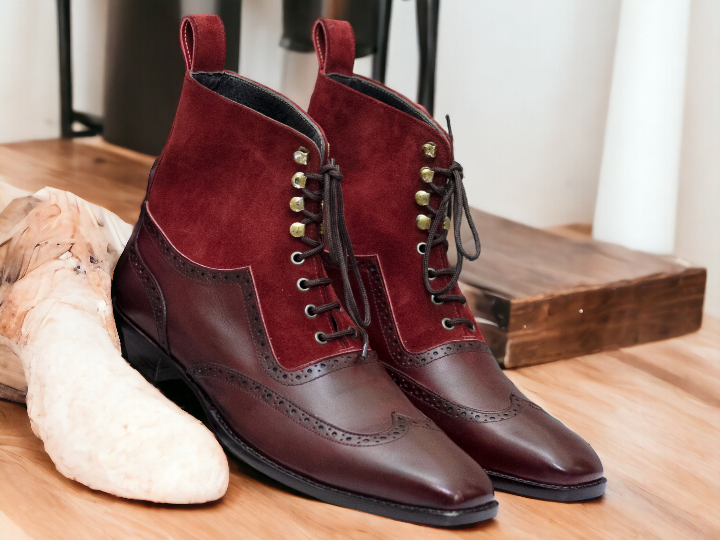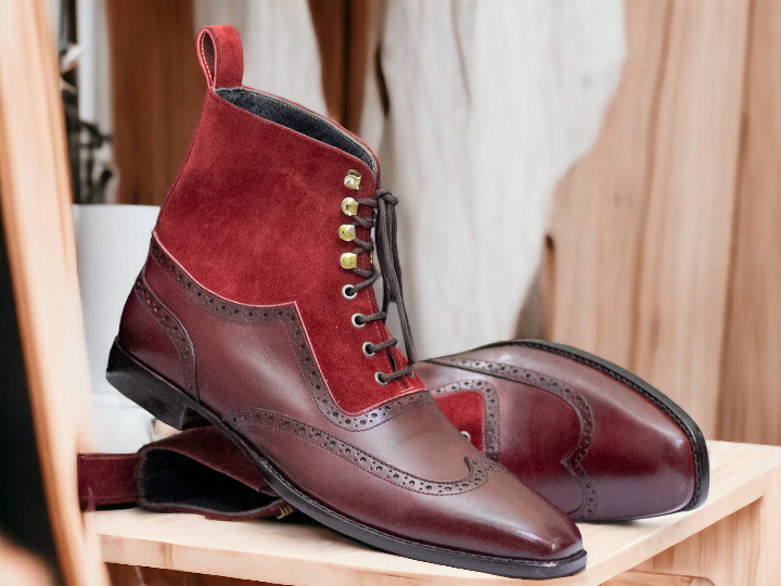 Men's Hanadmade Two Tone Leather And Suede Lace up ankle Boots, Wing Tip Boots