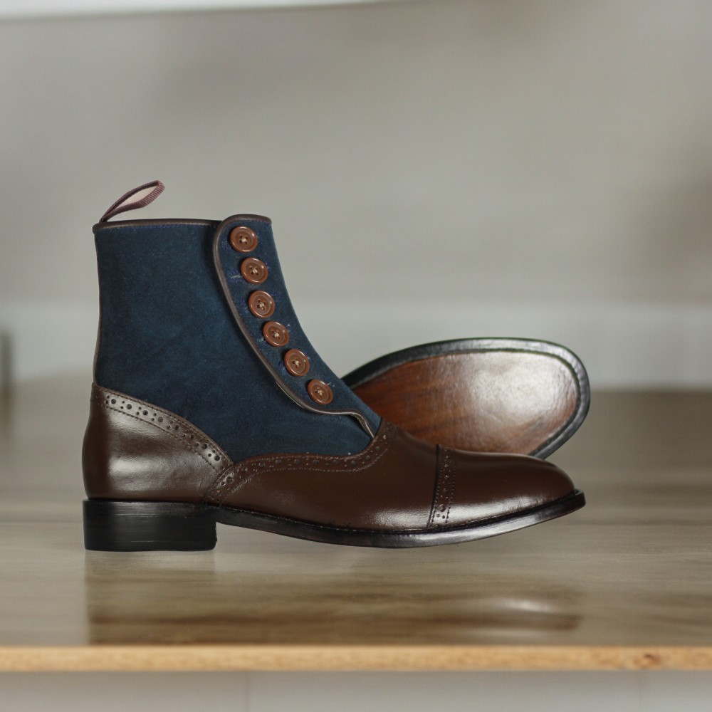 Men's Handmade Ankle High Navy Blue & Brown Leather Suede Button Boot
