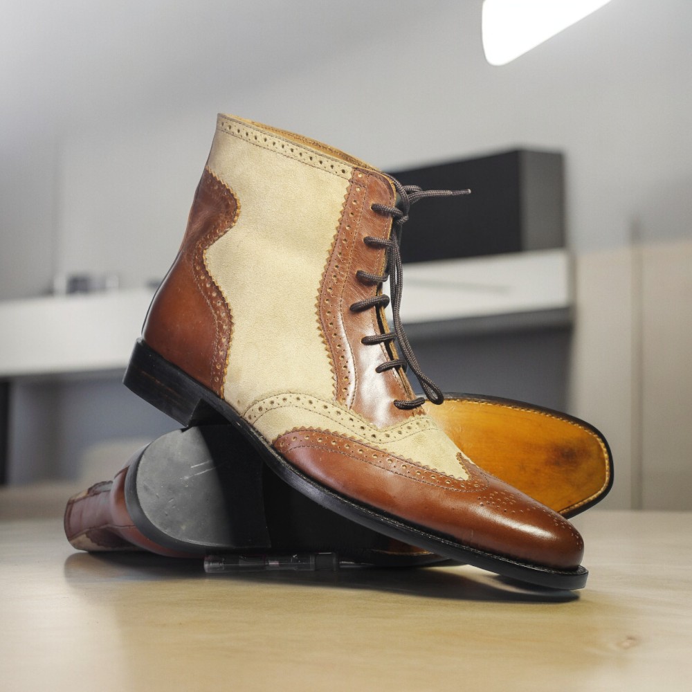 Handmade Ankle High Brown Beige Lace Up Leather Suede Boot, Classic Boot