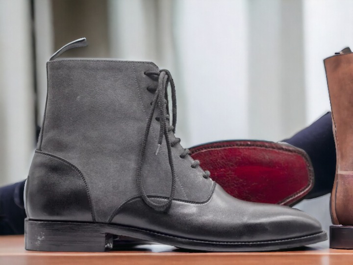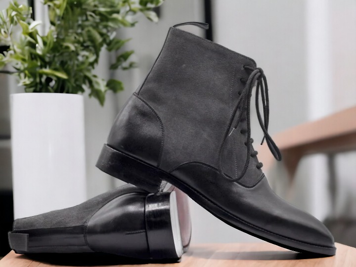 Handmade Ankle High Black Grey Leather Suede Lace Up Boot For Men's
