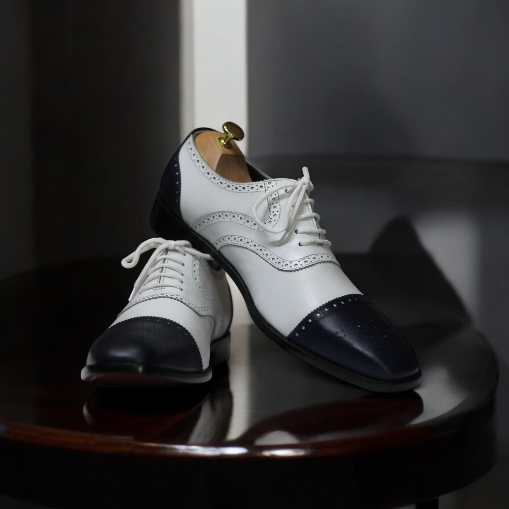 Handmade Black & White Leather Cap Toe Oxford Shoes For Men's
