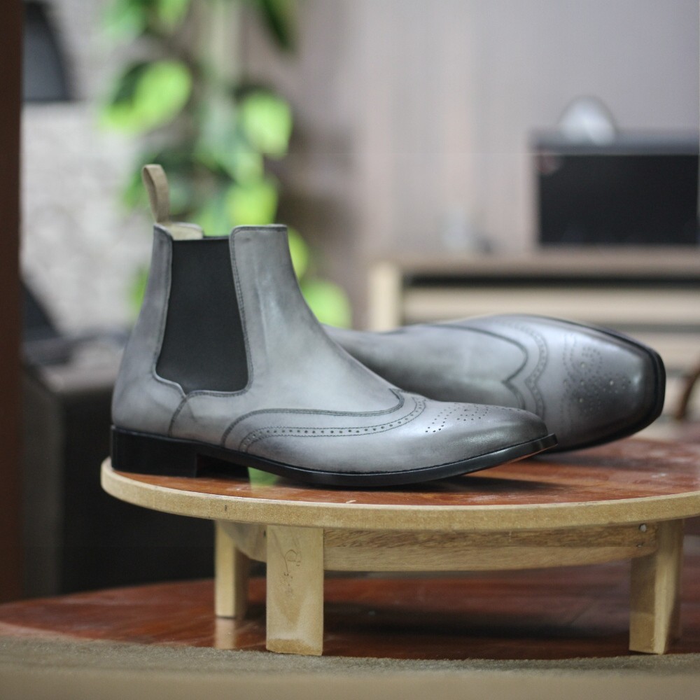 Men's Ankle High Grey Leather Chelsea Wing Tip Boot