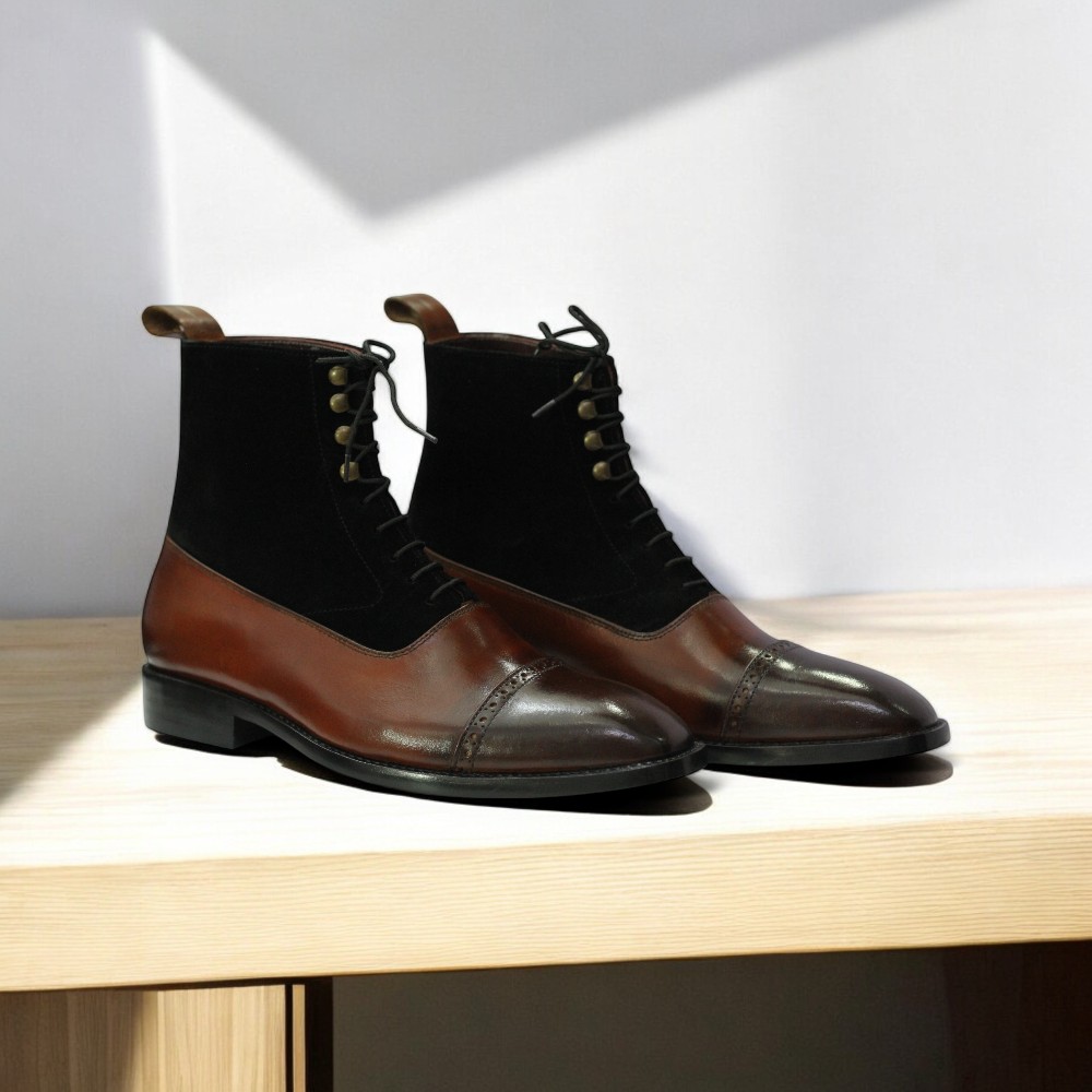 Elegant Handmade Brown Leather & Black Suede Cap Toe Ankle Boots